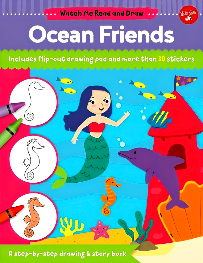 The Watch Me Read and Draw book series is special because it blends two things together that kids love: reading and drawing! It’s easy and fun to learn to draw, especially when there’s a story to read and lots of stickers. In Watch Me Read and Draw: Ocean Friends, kids will follow along with the adorable story of Alana the Mermaid while they learn to draw all the characters in the book, one step at a time. Included are drawing instructions for a dolphin, a seahorse, an angelfish, a crab, a whale, a sea lion, a stingray, a jellyfish, a shark, an octopus, and Alana herself!