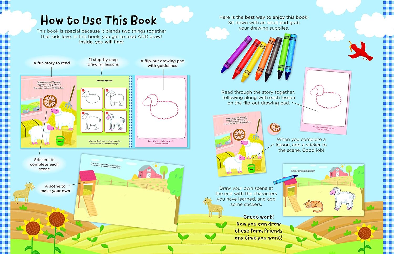 Each page features easy-to-follow instructions for drawing all of the characters from the story, one step at a time. Basic shapes that kids will recognize make it easy to follow along and learn how to draw. The flip-out drawing pad also offers drawing prompts and simple shapes for a jump-start, making it enjoyable and fun to draw favorite farm animals. Plus, there’s a whole bunch of colorful stickers inside to reward them as they complete the story along the way, and a farm scene at the end to make their very own! It’s the perfect starter drawing book for kids who love to read and draw.