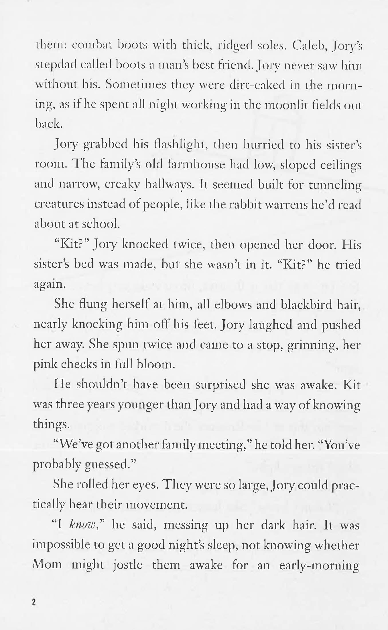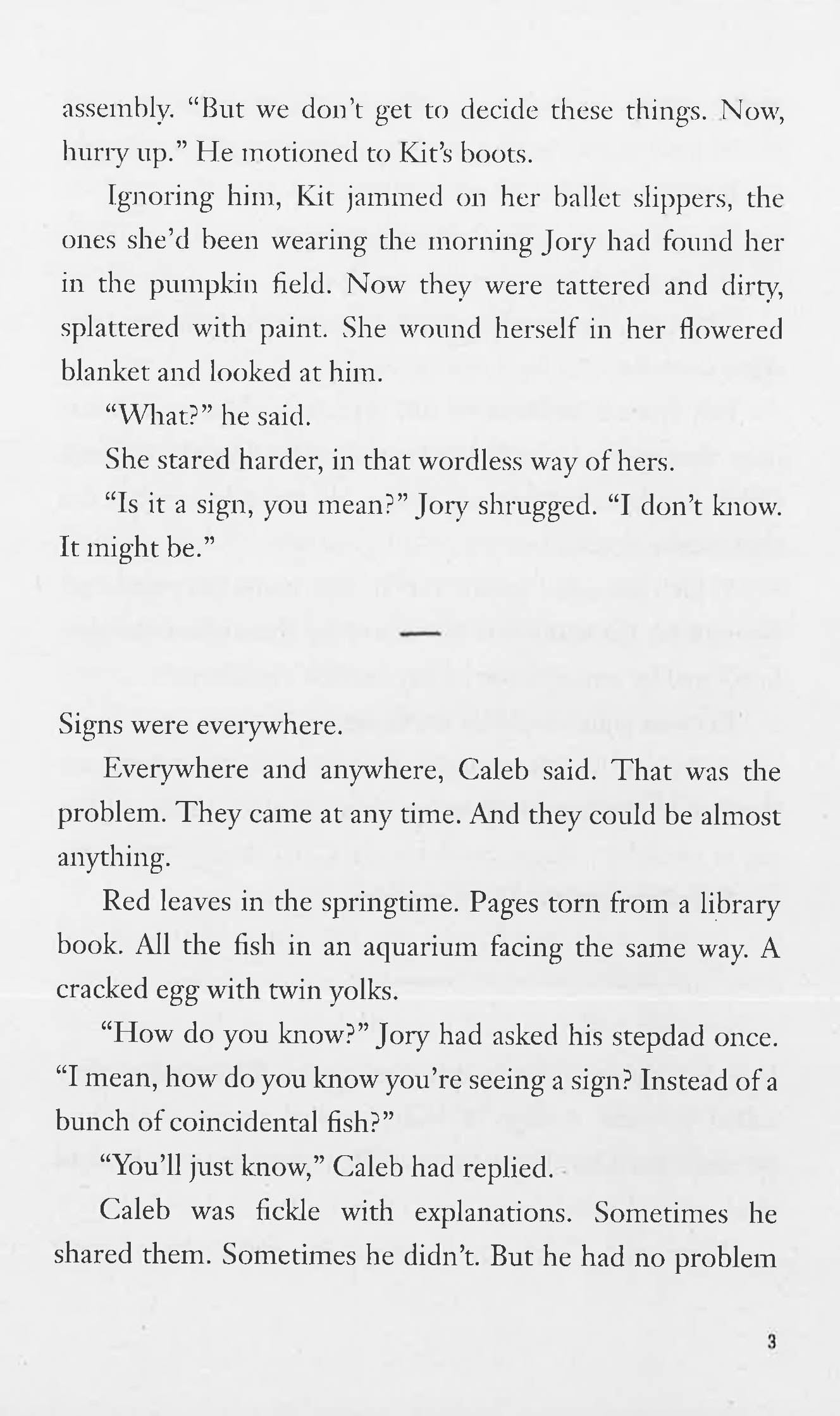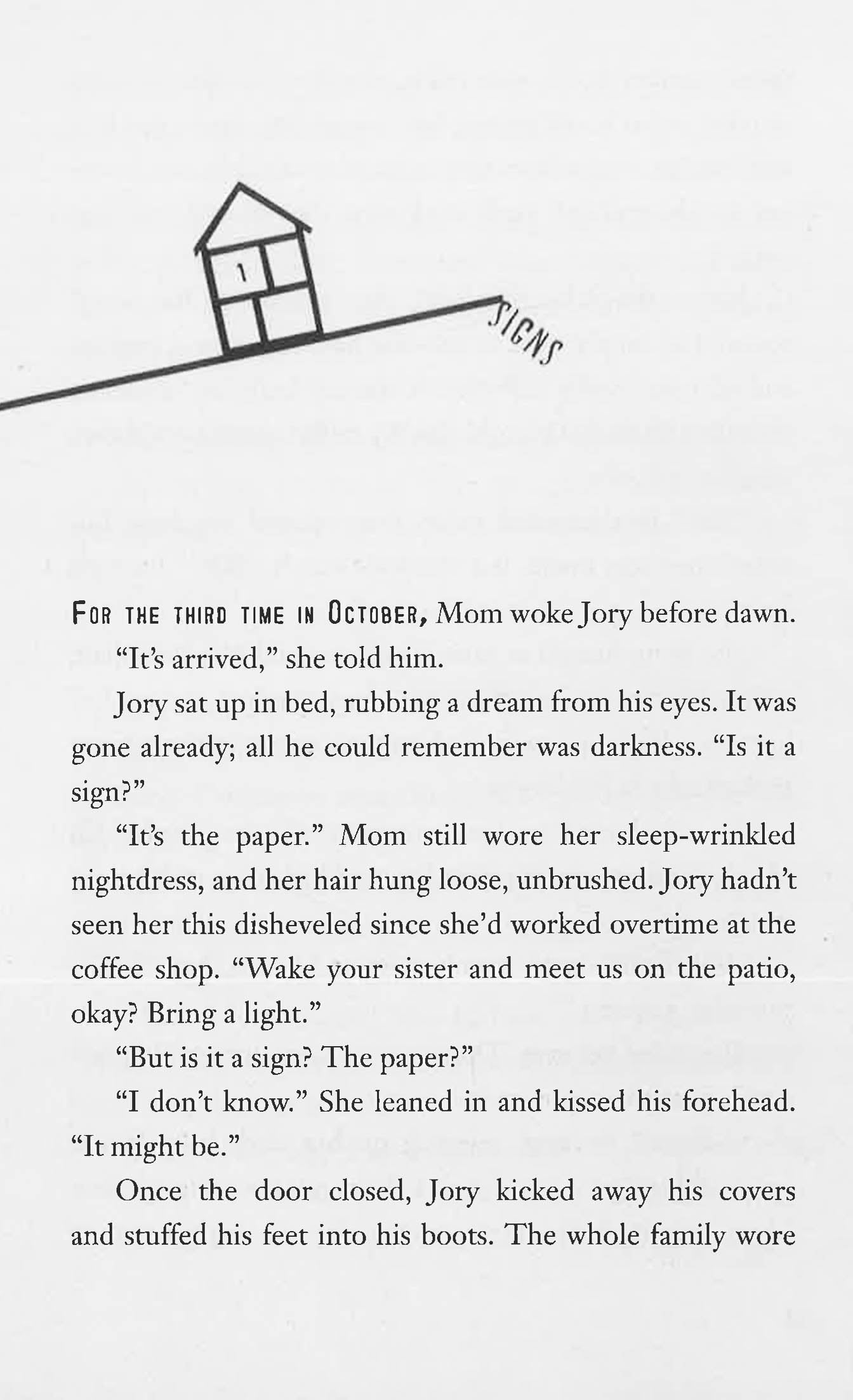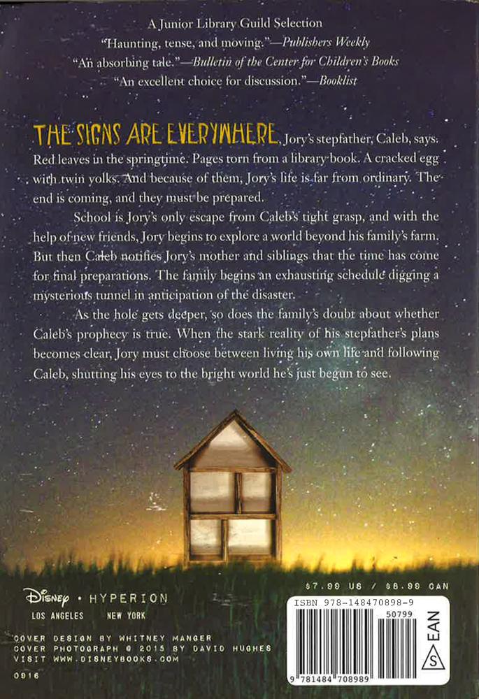 The signs are everywhere, Jory's stepfather, Caleb, says. Red leaves in the springtime. Pages torn from a library book. All the fish in the aquarium facing the same way. A cracked egg with twin yolks. Everywhere and anywhere. And because of them Jory's life is far from ordinary. He must follow a very specific set of rules: don't trust anyone outside the family, have your works at the ready just in case, and always, always watch out for the signs. The end is coming, and they must be prepared. School is Jory's only escape from Caleb's tight grasp, and with the help of new friends Jory begins to explore a world beyond his family's farm. As Jory's friendships grow, Caleb notifies Jory's mother and siblings that the time has come for final preparations. They begin an exhausting schedule digging a mysterious tunnel in anticipation of the disaster. But as the hold gets deeper, so does the family's doubt about whether Caleb's prophecy is true. When the stark reality of his stepfather's plans becomes clear, Jory must choose between living his own life or following Caleb, shutting his eyes to the bright world he's just begun to see.