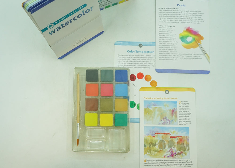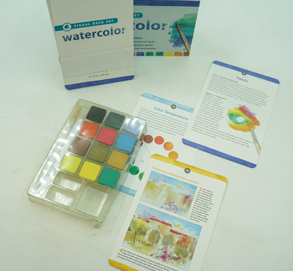 The world s classic art masterpieces weren t only created in oils; painters like Winslow Homer, Paul Cezanne, John Singer Sargent, and Egon Schiele also created famous works in watercolor. Tap into the right side of your brain and stimulate your creative center as you practice the art of watercolor painting. This deluxe compact kit has everything you need to get started, and is perfect for on-the-go creative adventures. Not sure how to paint? Don t worry; the instructional cards will guide you along the way. - Makes a perfect gift for yourself or others.- Inspires budding artists of all ages. "Watercolor: Visual Deck Set" is perfect for any level of artist and has everything you need to get started. Just add water and watch your talent grow!