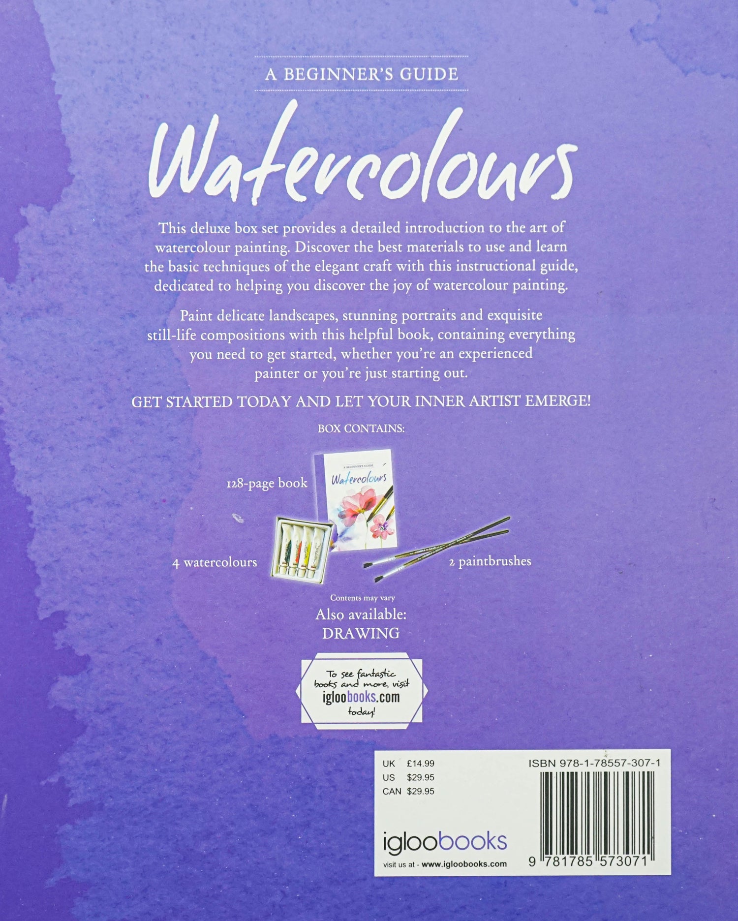 This deluxe box set provides a detailed introduction to the art of watercolour painting. Discover the best materials to use and learn the basic techniques of the elegant craft with this instructional guide, dedicated to helping you discover the joy of watercolour painting. Paint delicate landscapes, stunning portraits and exquisite still-life compositions with this helpful book, containing everything you need to get started, whether you're an experienced painter or you're just starting out.