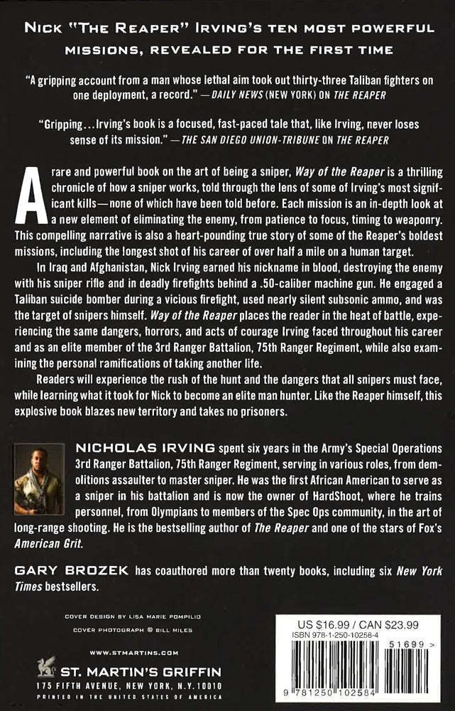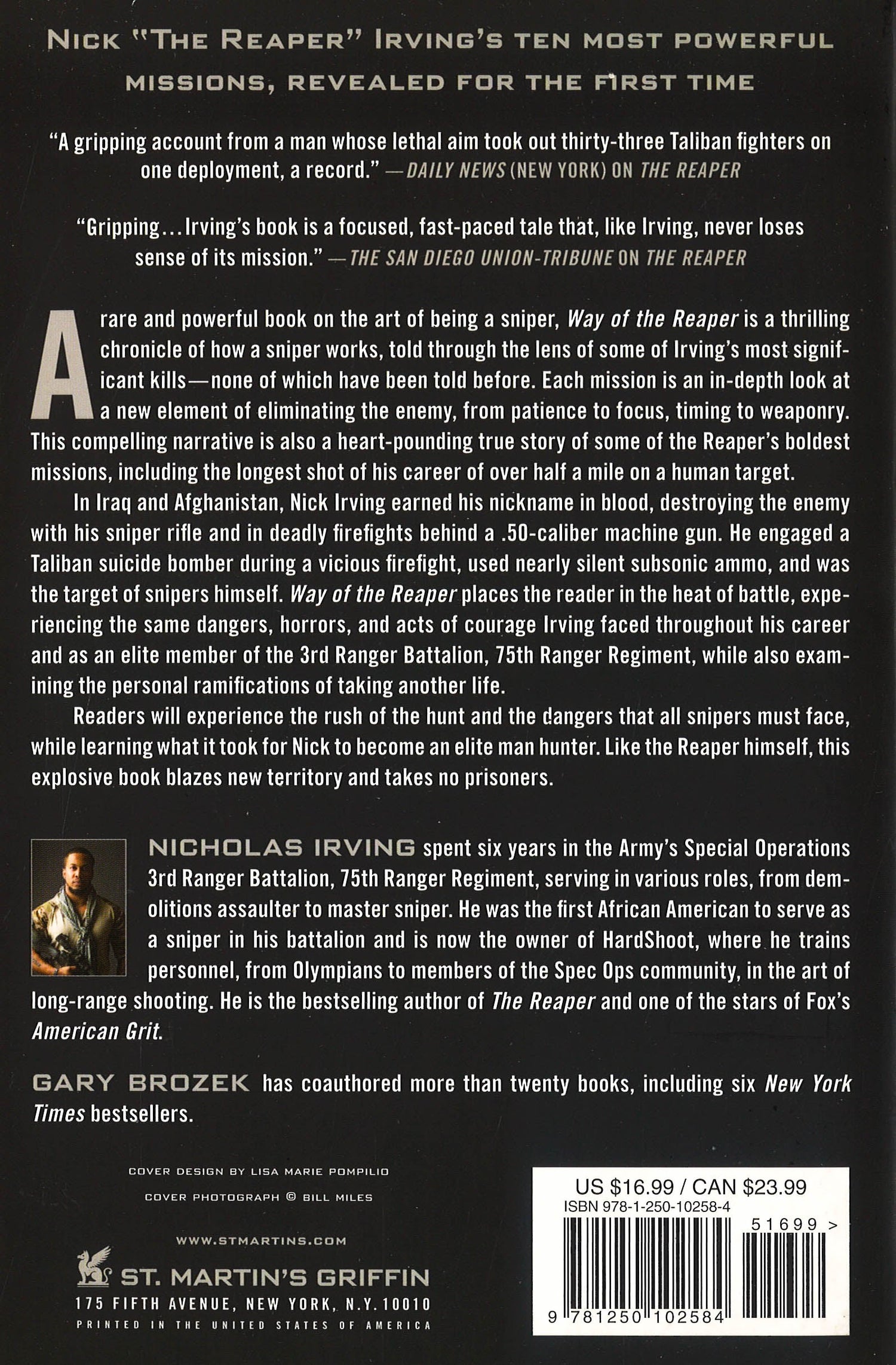 From the legendary special operations sniper and New York Times bestselling author of The Reaper comes a rare and powerful book on the art of being a sniper. Way of the Reaper is a step- by-step accounting of how a sniper works, through the lens of Irving's most significant missions - none of which have been told before. Each mission is an in-depth look at a new element of eliminating the enemy, from intel to luck, recon to weaponry. Told in a thrilling narrative, this is also a heart-pounding true story of some of The Reaper's boldest missions including the longest shot of his career on a human target of over half a mile. In Iraq and Afghanistan, Nick Irving earned his nickname in blood, destroying the enemy with his sniper rifle and in deadly firefights behind a .50 caliber machine gun. He engaged a Taliban suicide bomber during a vicious firefight, used nearly silent sub-sonic ammo, and was the target of snipers himself. Way of the Reaper attempts to place the reader in the heat of battle, experiencing the same dangers, horrors and acts of courage Irving faced as an elite member of the 3rd Ranger Battalion.Readers will experience the dangers that all snipers must face, while learning what it takes to come an elite man hunter. Like the Reaper himself, this explosive book blazes new territory and takes no prisoners.