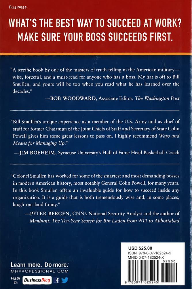WHAT'S THE BEST WAY TO SUCCEED AT WORK? MAKE SURE YOUR BOSS SUCCEEDS FIRST.Today's typical workplace may be less formal and more inclusive than those of the past, but one thing hasn't changed: The boss is the boss. A veteran of the U.S. Army, William Smullen spent 50 years leading--and being led by--some of the toughest people in the business. Over his career, he served at every level from platoon to division--and at the highest levels in the Pentagon, as well. In business terms, that's the equivalent of running a very small business to sitting in a corporate C-Suite. Smullen's final public-service assignment was chief of staff to Secretary of State Colin L. Powell. As chief of staff, one of his main responsibilities was to ensure Secretary Powell kept his positive image and was successful in everything he did. Now, he shares the lessons he learned working in some of the world's most demanding organizations. In Ways and Means for Managing Up, he tells you everything you need to know to effectively "manage your manager" in ways that help both you and your boss succeed and rise within your company. In 50 short yet informative chapters,Smullen shares his hard-won insight, such as: View your relationship with your boss as a partnership. Think of your boss as a brand. Never allow your boss to be surprised.Help your boss manage risk or crisis. Be a strategic asset your boss counts on. Whether you're good friends with your manager or have trouble coexisting in the same office, your success depends on his or her success. This has always been true, and it will always be true. You serve yourself well when you serve your boss well. Take your career to new heights by learning and applying the Ways and Means for Managing Up. It can serve as a survival guide, a road map, or a blueprint for people at every level in an organization.
