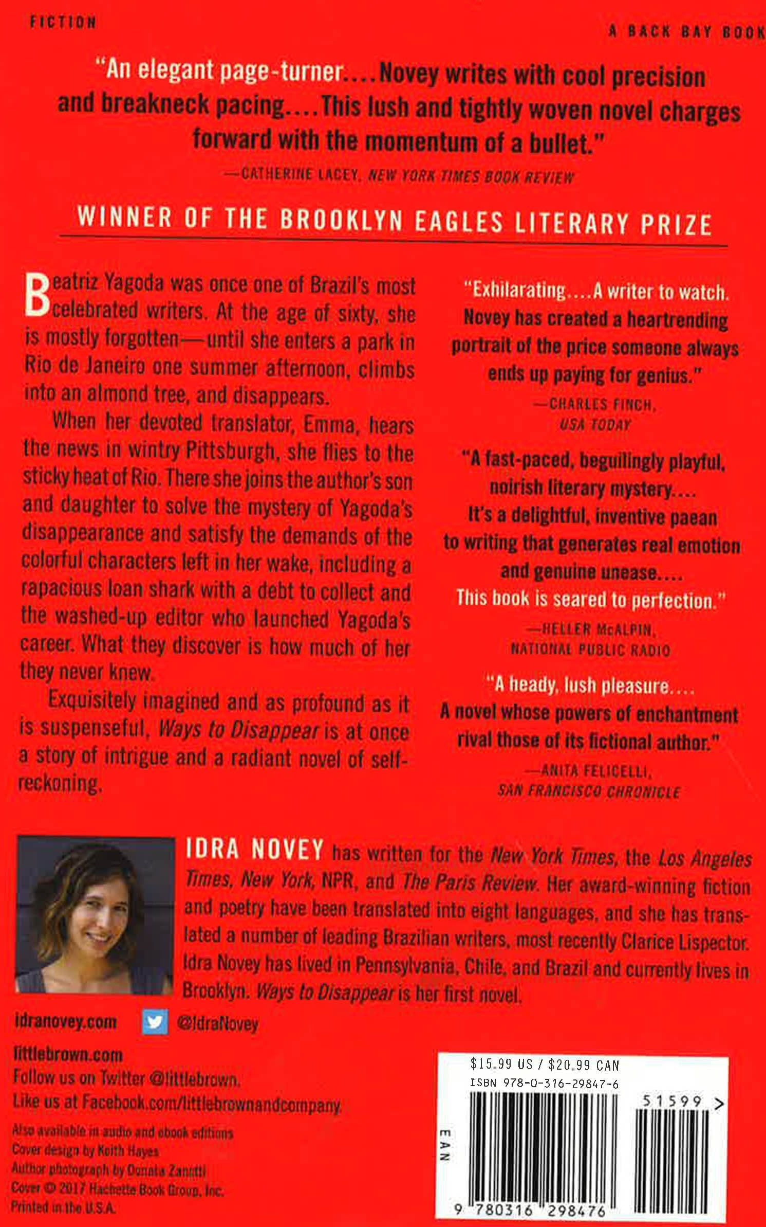 Beatriz Yagoda was once one of Brazil's most celebrated authors. At the age of sixty, she is mostly forgotten - until one summer afternoon when she enters a park in Rio de Janeiro, climbs into an almond tree, and disappears.When her devoted translator Emma hears the news in wintry Pittsburgh, she flies to the sticky heat of Rio. There she joins the author's son and daughter to solve the mystery of Yagoda's disappearance and satisfy the demands of the colorful characters left in her wake, including a loan shark with a debt to collect and the washed-up editor who launched Yagoda's career. What they discover is how much of her they never knew.Exquisitely imagined and as profound as it is suspenseful, Ways to Disappear is at once a thrilling story of intrigue and a radiant novel of self-reckoning.