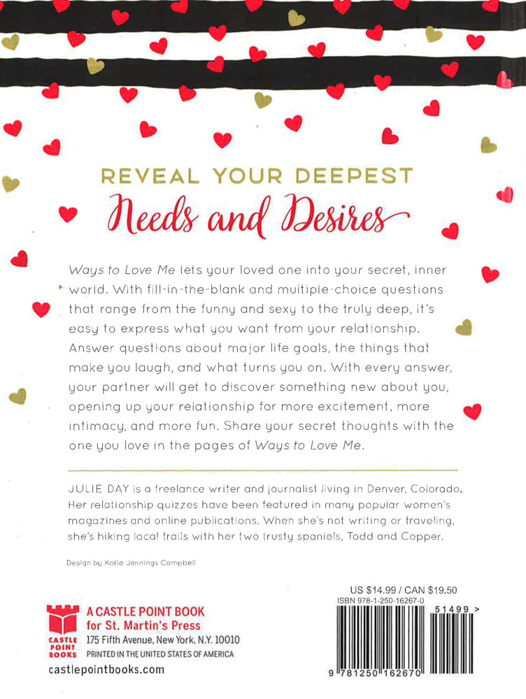A guided journal for lovers to fill out for each other, this book lets your loved one into your secret, inner world. He or she will discover how you feel about major life choices, along with what makes you laugh, tears you up inside, and turns you on. The perfect gift for anyone in a new relationship, a bridal shower, or just to help your partner understand you better! Sample prompts: When I'm sad, I need to be:___Cheered up, ___Held,___Commiserated with,___Left alone The one thing I'd like you to try in bed is_____________________A bubble bath for two sounds:___ Sensual Crowded.