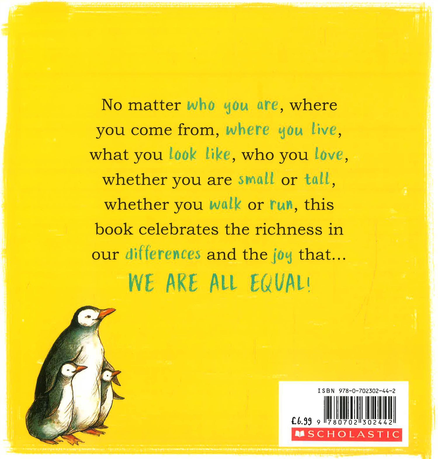 No matter who you are, where you come from, where you live, what you look like, who you love, whether you are small or tall, whether you walk or run, this book celebrates the richness in our differences and the joy that: we are all equal.