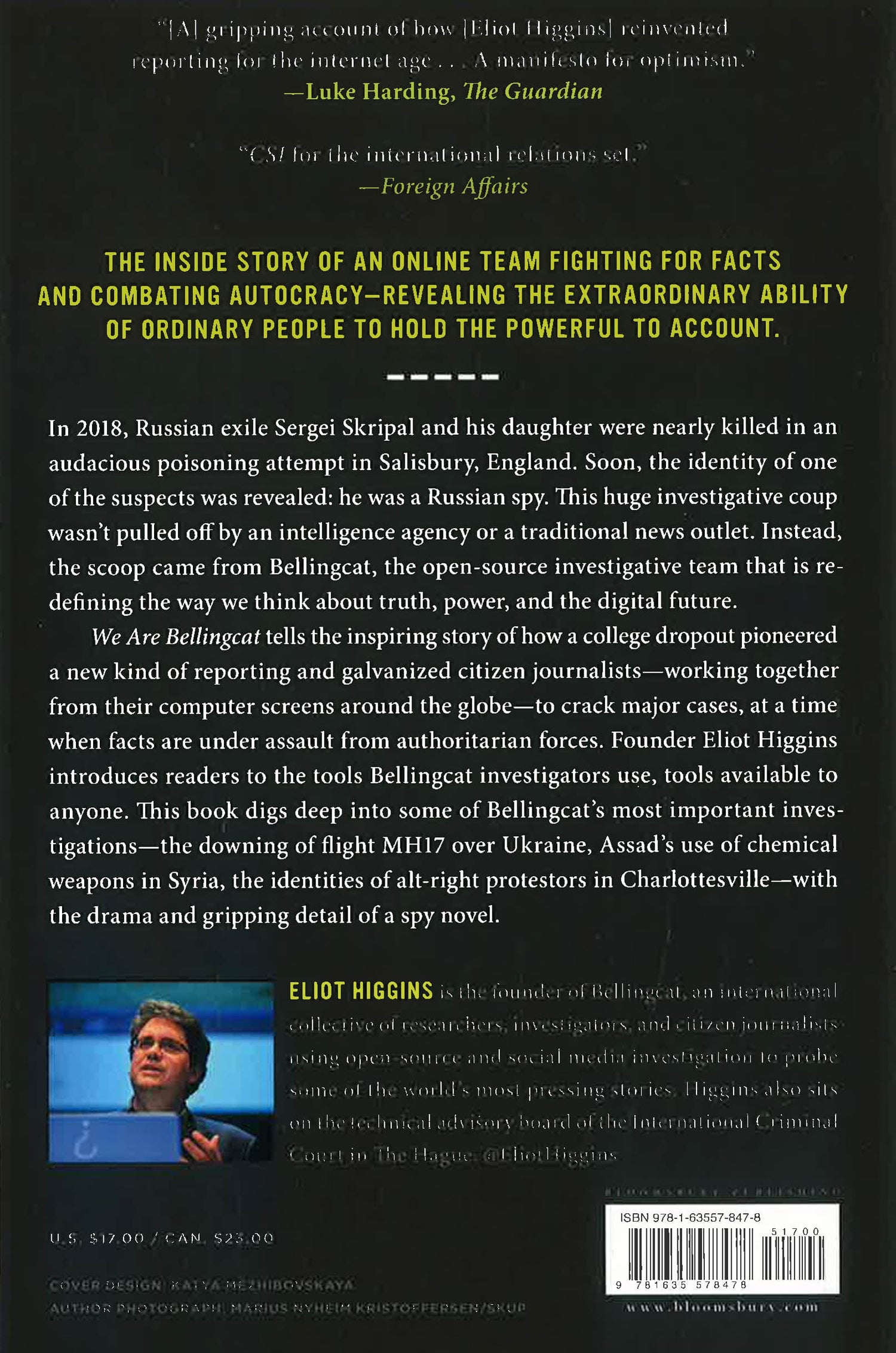 We Are Bellingcat tells the inspiring story of how a college dropout pioneered a new category of reporting and galvanized citizen journalists-working together from their computer screens around the globe-to crack major cases, at a time when fact-based journalism is under assault from authoritarian forces. Founder Eliot Higgins introduces readers to the tools Bellingcat investigators use, tools available to anyone, from software that helps you pinpoint the location of an image, to an app that can nail down the time that photo was taken. This book digs deep into some of Bellingcat's most important investigations-the downing of flight MH17 over Ukraine, Assad's use of chemical weapons in Syria, the identities of alt-right protestors in Charlottesville-with the drama and gripping detail of a spy novel.