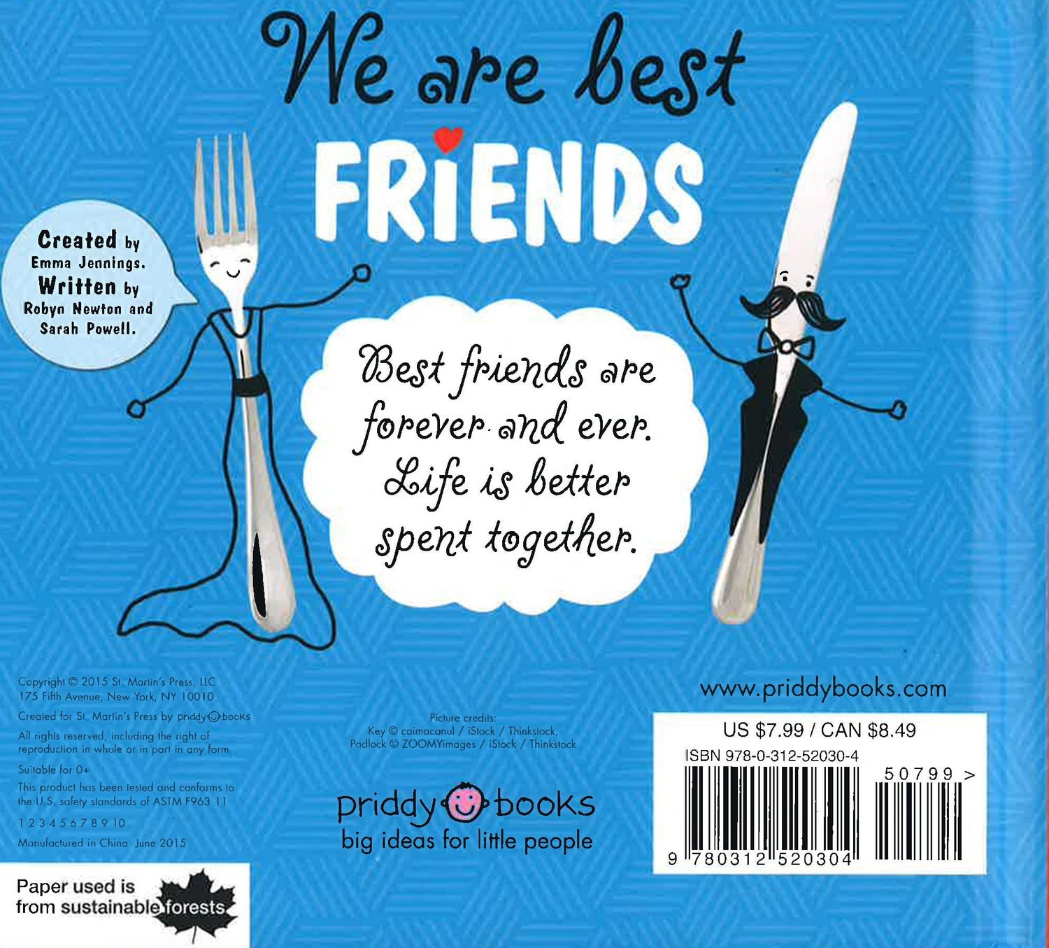 A lively celebration of friendship features engaging cartoon images of pairs that just belong together as representations of forever friends, including salt and pepper, knives and forks, and milk and cookies. *This book may have remainder mark*