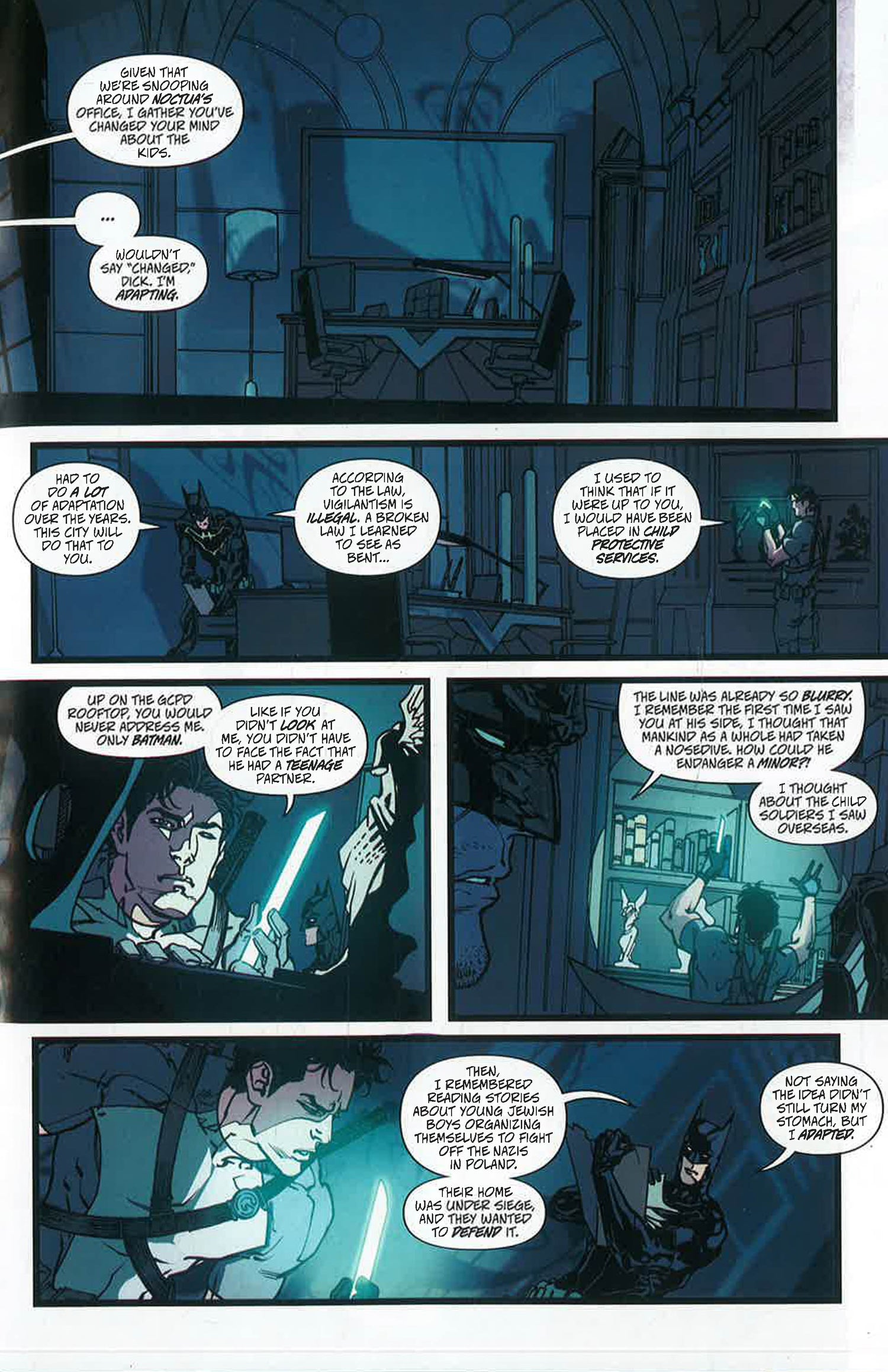 But now being a Robin means being a criminal. Robin colors are illegal, and the Robins have gone back underground. Some of them—like Duke Thomas, on a quest to find his parents—have other things on their mind. Some of them are exploring new, more dangerous ways to become vigilantes.