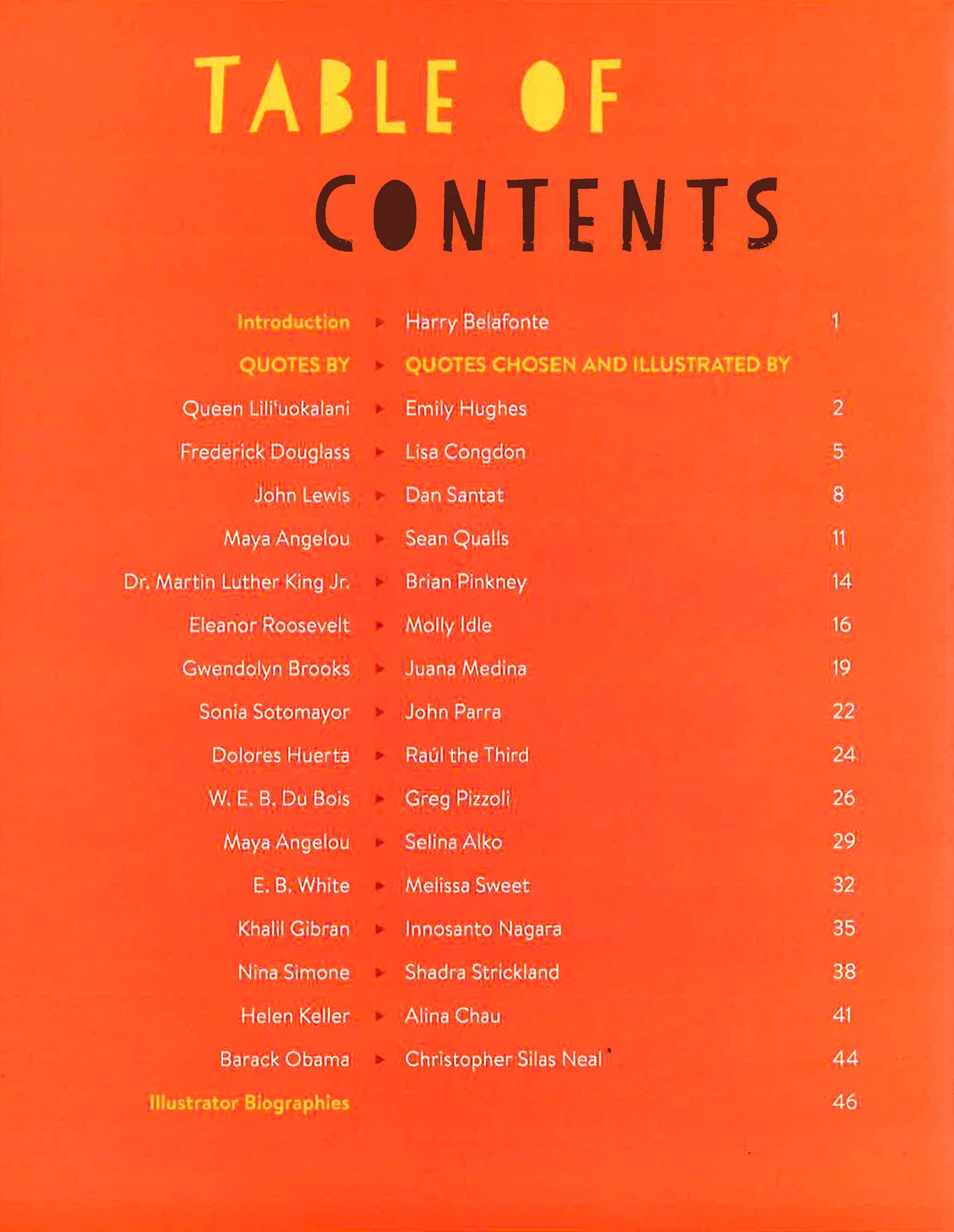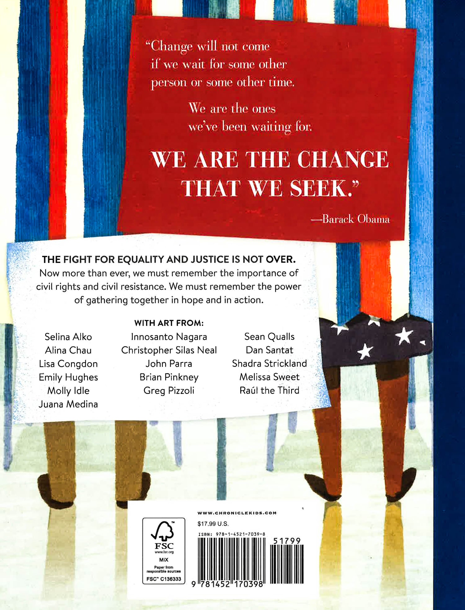 Sixteen award-winning children's book artists illustrate the civil rights quotations that inspire them in this stirring and beautiful book. Featuring an introduction by Harry Belafonte, words from Eleanor Roosevelt, Maya Angelou, and Dr. Martin Luther King, Jr. among others, this inspirational collection sets a powerful example for generations of young leaders to come. It includes illustrations by Selina Alko, Alina Chau, Lisa Congdon, Emily Hughes, Molly Idle, Juana Medina, Innosanto Nagara, Christopher Silas Neal, John Parra, Brian Pinkney, Greg Pizzoli, Sean Qualls, Dan Santat, Shadra Strickland, Melissa Sweet, and Raul the Third.