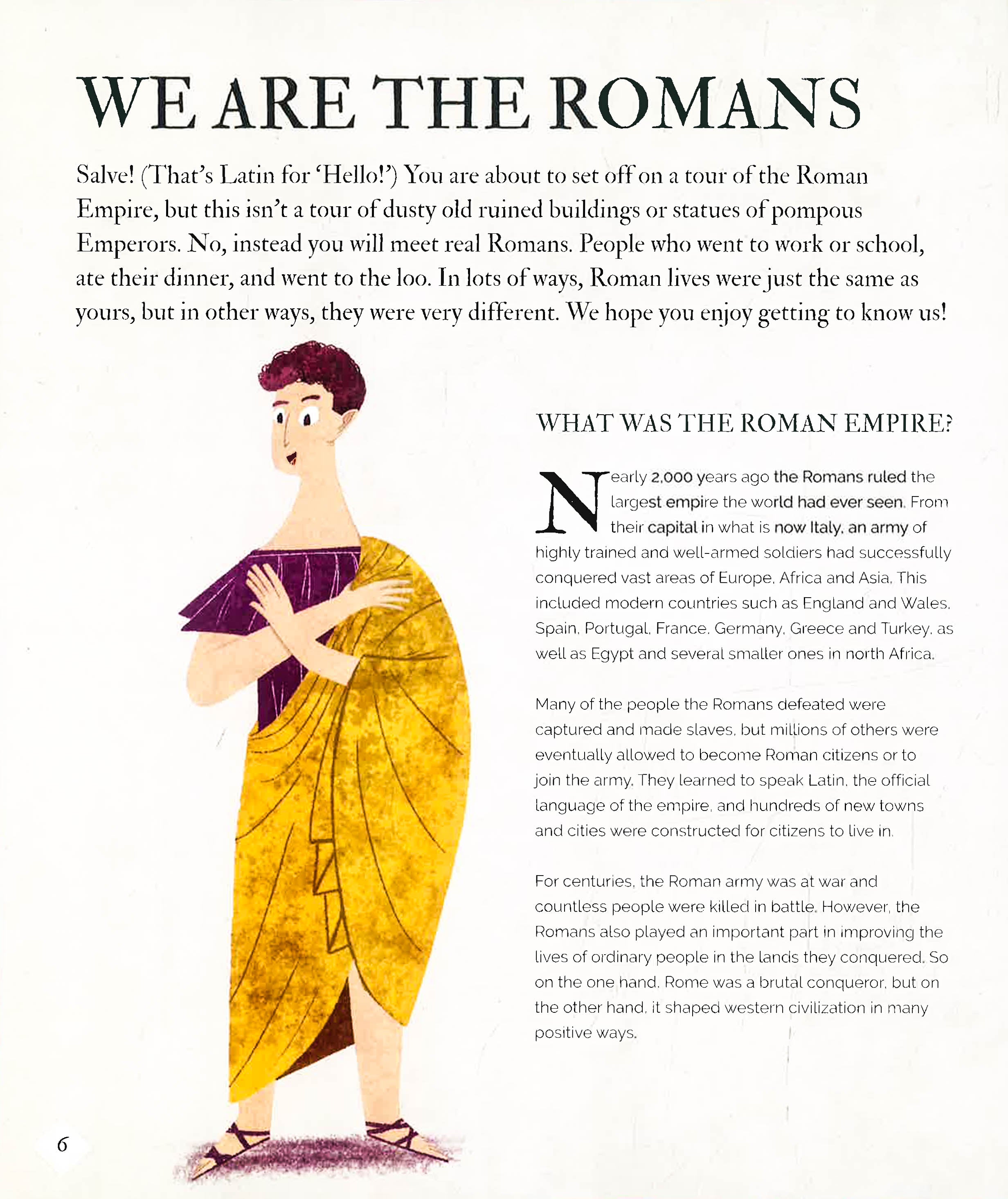 Step back in time to Ancient Rome and meet some of the many people who lived, worked, and played during that time. From a young slave boy to a fierce gladiator, a musician to a wealthy lady, and a mosaic artist to the emperor himself - each one will share with you the story of their own daily life. Together, they are the Romans.