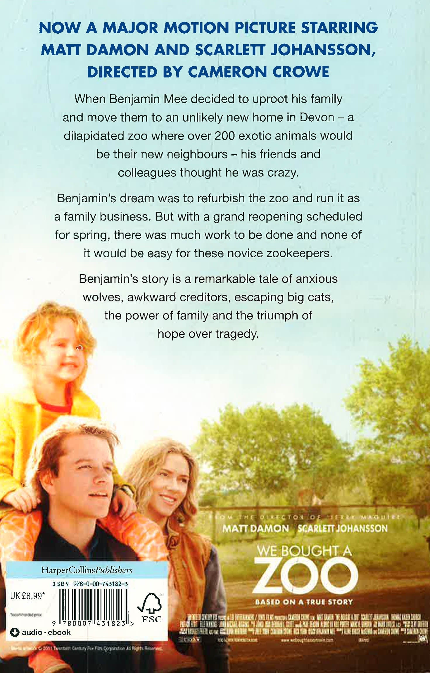 An amazing true story that has inspired the major Hollywood motion picture this Christmas, to be repackaged for release alongside the film. We Bought a Zoo is about one young family, a broken down zoo, and the wild animals that changed their lives forever. When Ben [played by Damon] and his wife Katherine [played by Johansson] sold their small flat in Primrose Hill, upped sticks with their children and invested their savings into a dilapidated zoo on the edge of Dartmoor, they were prepared for a challenge and a momentous change in all their lives. With over 200 exotic animals to care for - including an African lion, a wolf pack, a Brazilian tapir and a jaguar - Ben's hands, and those of his wife, children and tiny team of keepers, were full.