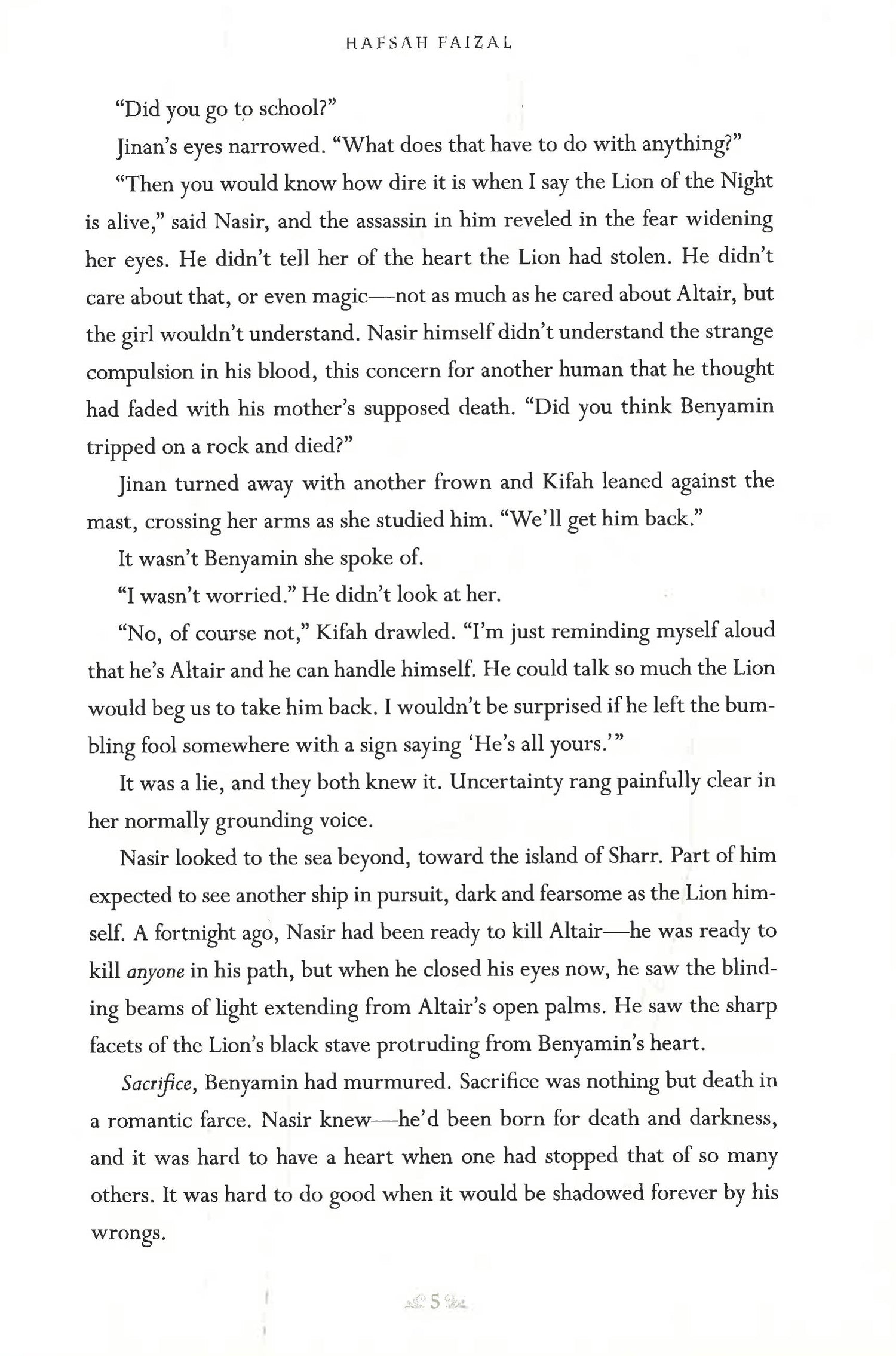 The battle on Sharr is over. The Arz has fallen. Altair may be captive, but Zafira, Nasir, and Kifah are bound for Sultan's Keep, determined to finish the plan Altair set in motion: restoring the hearts of the Sisters of Old to the minarets of each caliphate, finally bringing magic to all of Arawiya. But they are low on resources and allies alike, and the kingdom teems with fear of the Lion of the Night's return.