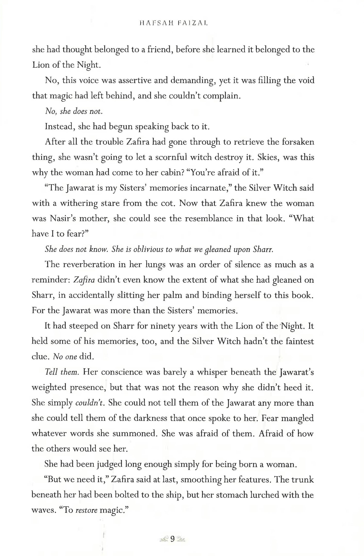 As the zumra plots to overthrow Arawiya's darkest threat, Nasir fights to command the magic in his blood. He must learn to hone his power, to wield it against not only the Lion but his father as well, trapped under the Lion's control. Zafira battles a very different darkness festering in her through her bond with the Jawarat--it hums with voices, pushing her to the brink of sanity and to the edge of a chaos she dares not unleash. In spite of everything, Zafira and Nasir find themselves falling into a love they can't stand to lose . . . But time is running out, and if order is to be restored, drastic sacrifices will have to be made.