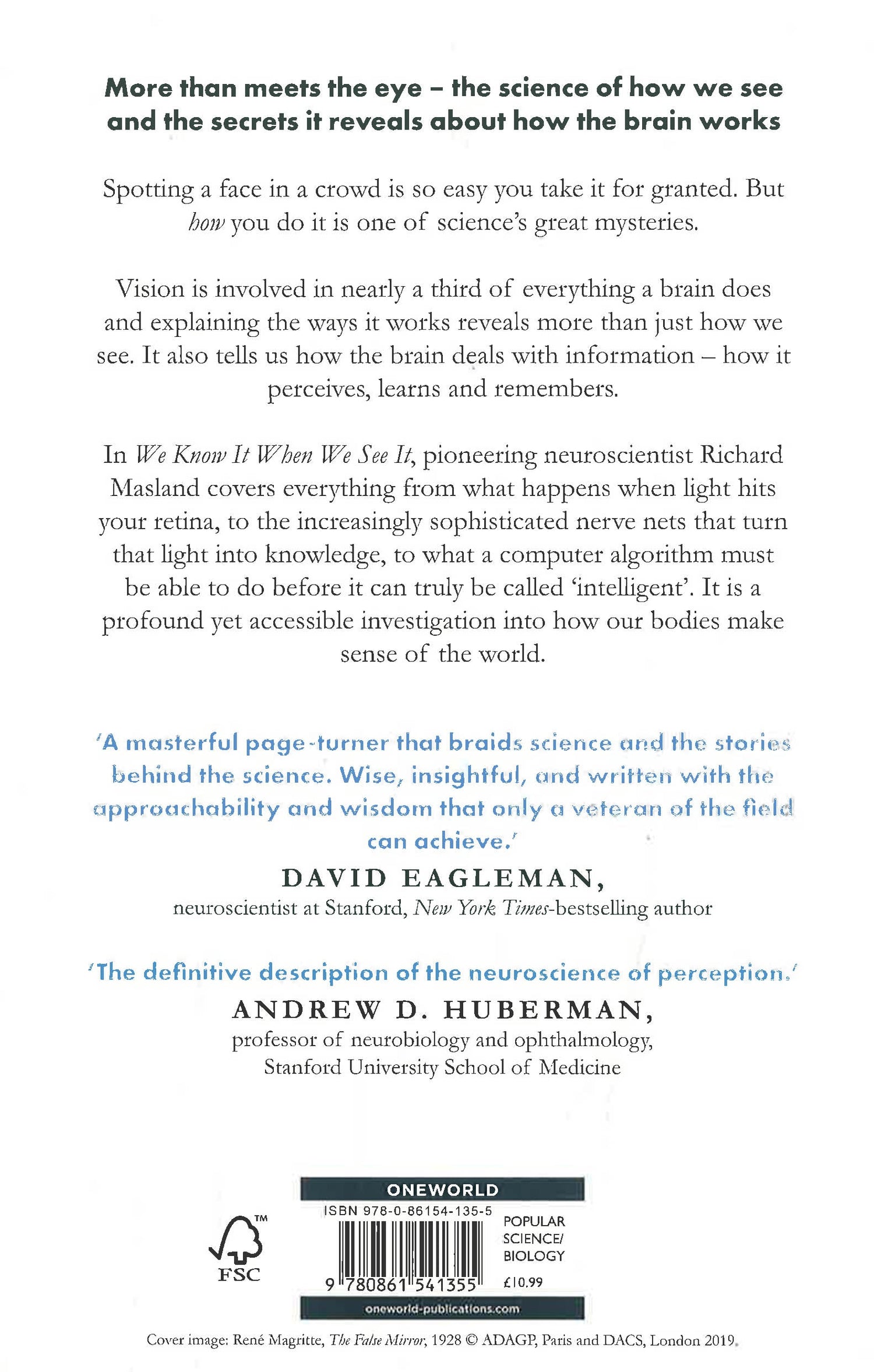 In We Know It When We See It, pioneering neuroscientist Richard Masland covers everything from what happens when light hits your retina, to the increasingly sophisticated nerve nets that turn that light into knowledge, to what a computer algorithm must be able to do before it can truly be called ‘intelligent’. It is a profound yet accessible investigation into how our bodies make sense of the world.