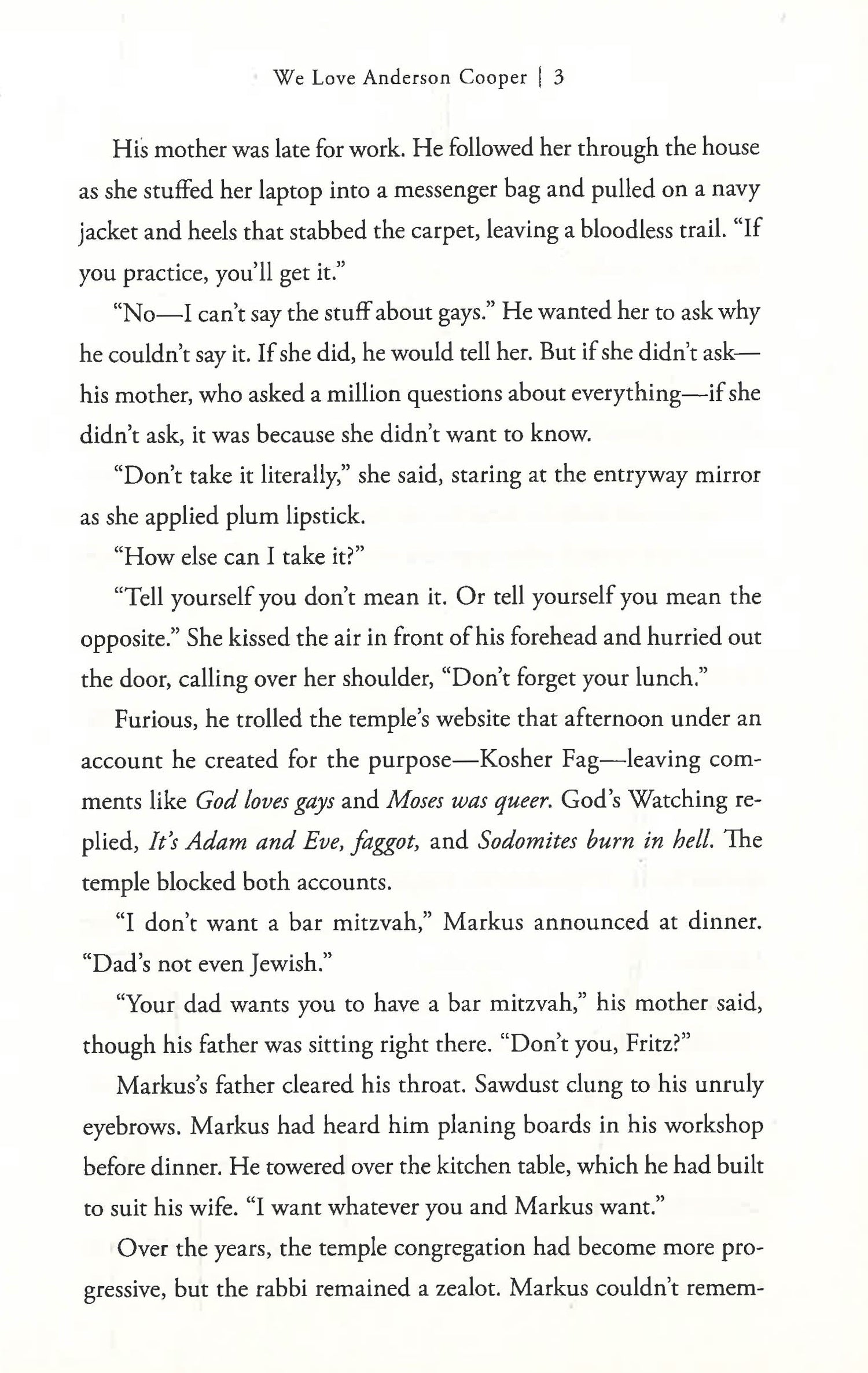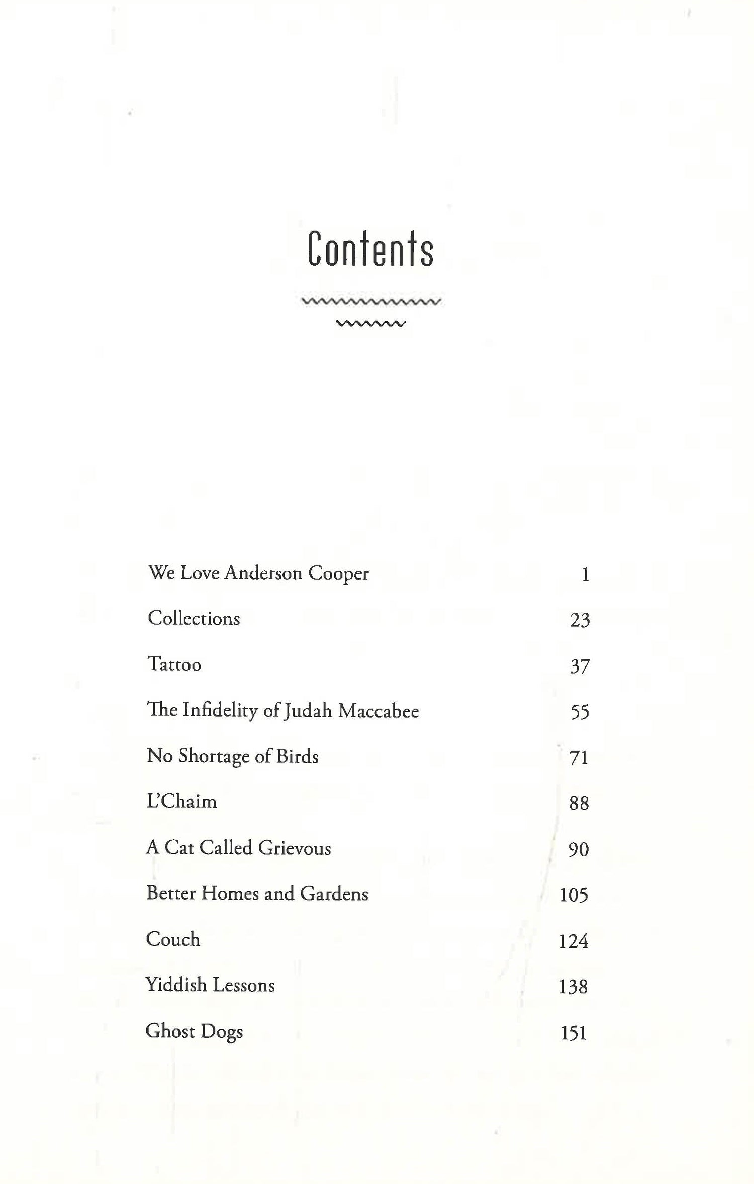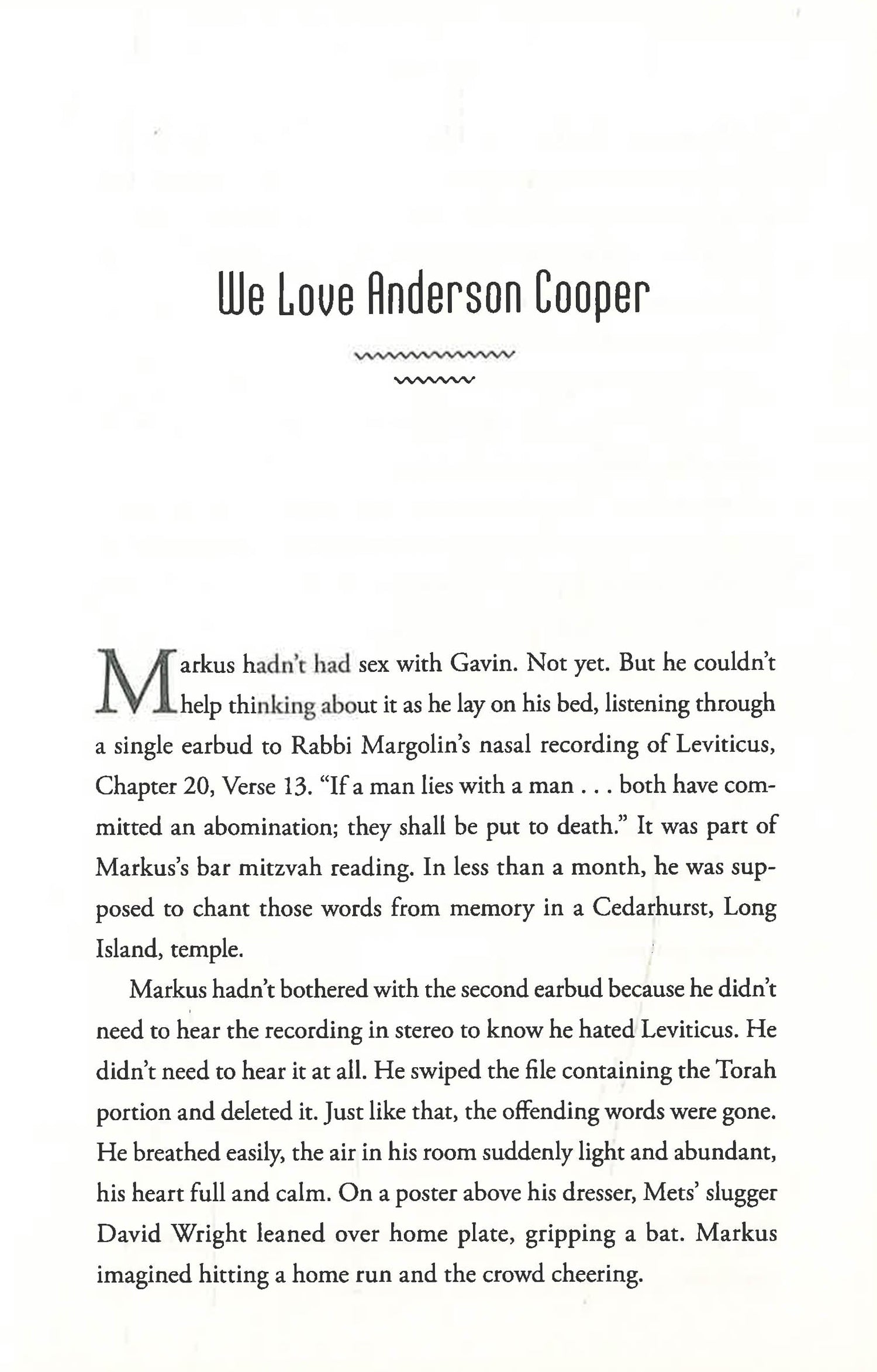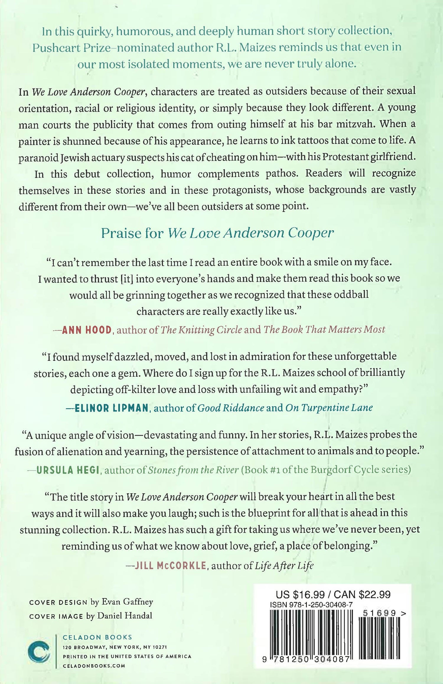 In We Love Anderson Cooper, characters are treated as outsiders because of their sexual orientation, racial or religious identity, or simply because they look different. A young man courts the publicity that comes from outing himself at his bar mitzvah. When a painter is shunned because of his appearance, he learns to ink tattoos that come to life. A paranoid Jewish actuary suspects his cat of cheating on him―with his Protestant girlfriend.