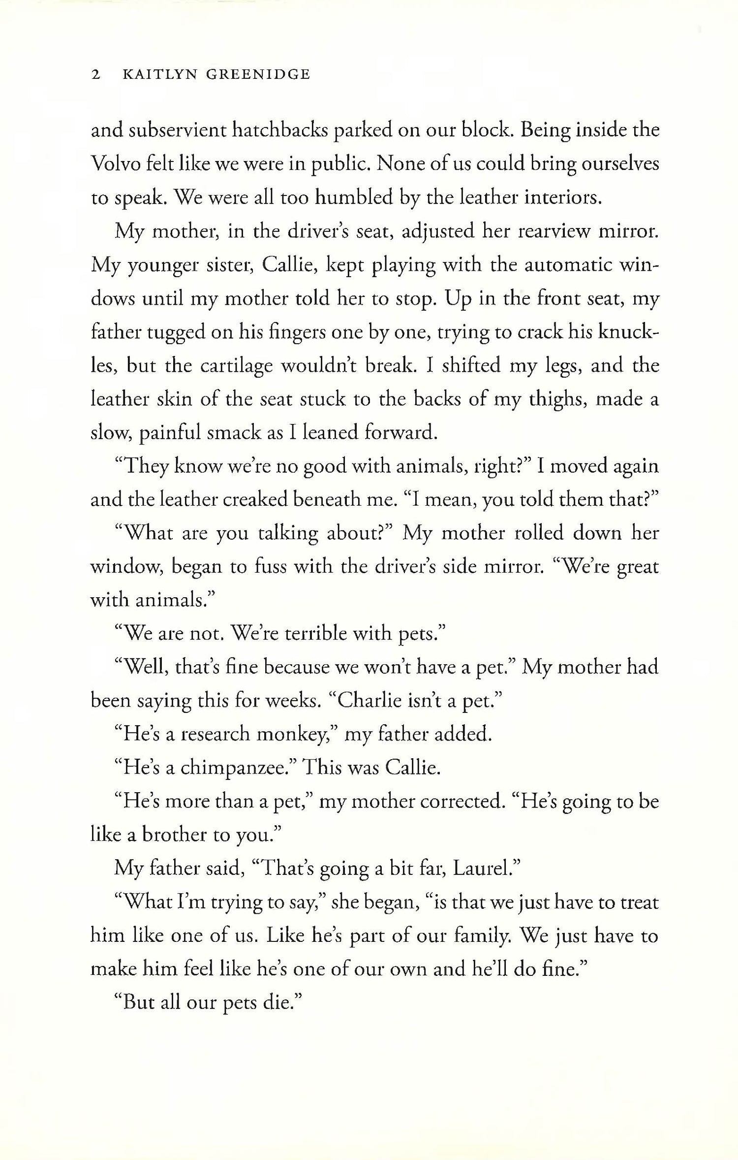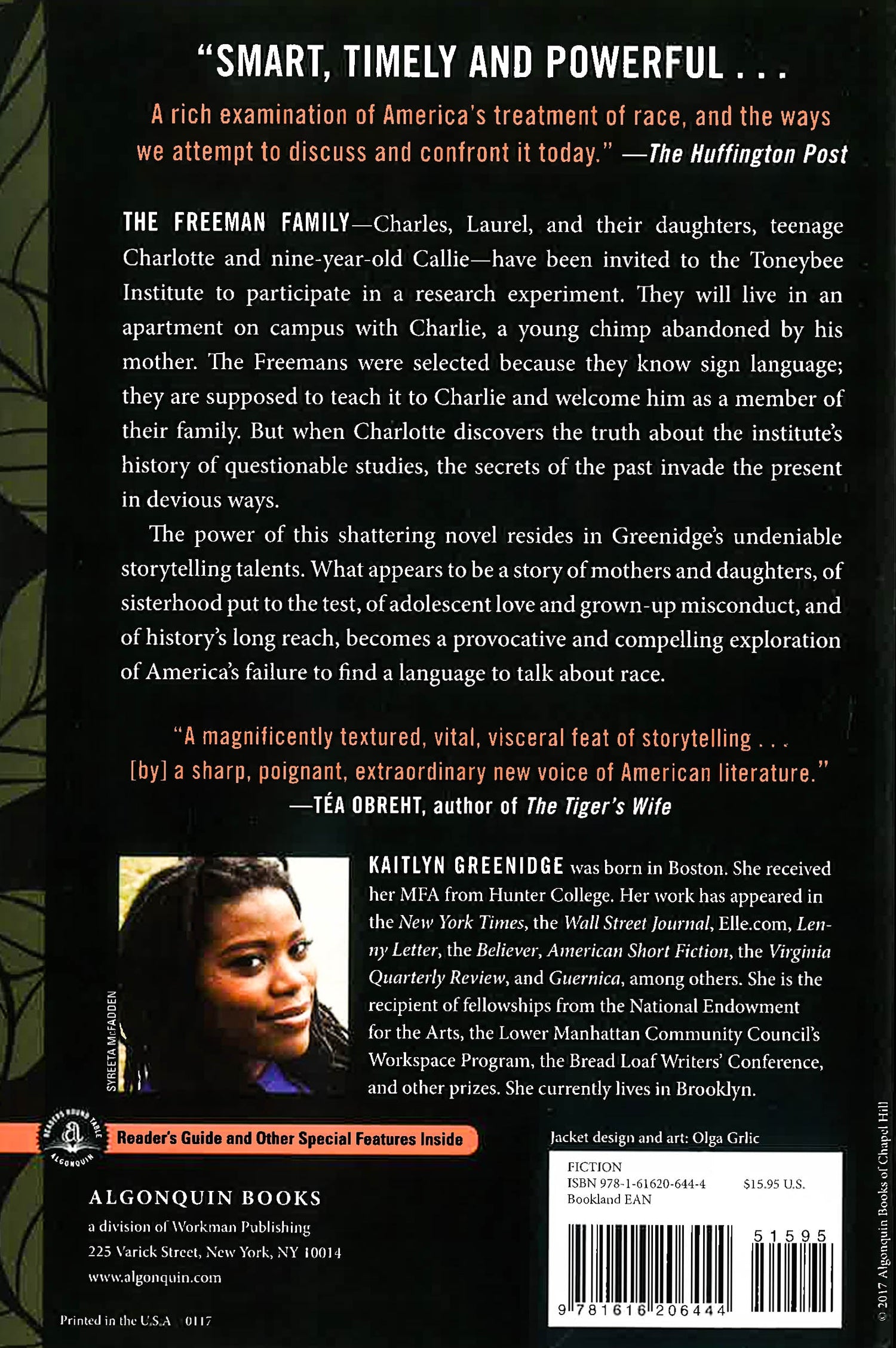 The Freeman family--Charles, Laurel, and their daughters, teenage Charlotte and nine-year-old Callie--have been invited to the Toneybee Institute to participate in a research experiment. They will live in an apartment on campus with Charlie, a young chimp abandoned by his mother. The Freemans were selected because they know sign language; they are supposed to teach it to Charlie and welcome him as a member of their family. But when Charlotte discovers the truth about the institute’s history of questionable studies, the secrets of the past invade the present in devious ways. The power of this shattering novel resides in Greenidge’s undeniable storytelling talents. What appears to be a story of mothers and daughters, of sisterhood put to the test, of adolescent love and grown-up misconduct, and of history’s long reach, becomes a provocative and compelling exploration of America’s failure to find a language to talk about race.