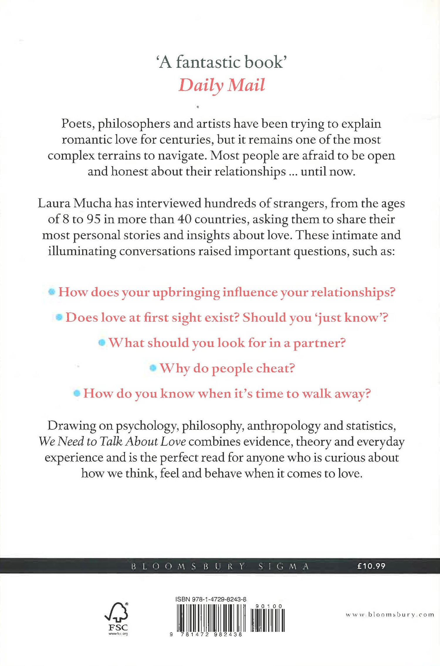 As featured on Sunday Brunch and Woman's Hour 'A really interesting proper analysis of the ins and outs of love. A kind of marvellous feat.' Richard Curtis Poets, philosophers and artists have been trying to explain romantic love for centuries, but it remains one of the most complex and intimidating terrains to navigate. Most people are afraid to be open and honest about their relationships – until now. For We Need to Talk Above Love, Laura Mucha has interviewed hundreds of strangers, from the ages of 8 to 95 in more than 40 countries, asking them to share their most personal stories, feelings and insights about love. These intimate and illuminating conversations raised important questions, such as: - How does your upbringing influence your relationships? - Does love at first sight exist? Should you 'just know'? - What should you look for in a partner? - Is monogamy natural? - Why do people cheat? - How do you know when it's time to walk away? Drawing on psychology, philosophy, anthropology and statistics, We Need to Talk About Love combines evidence, theory and everyday experience and is the perfect read for anyone who is curious about how we think, feel and behave when it comes to love.