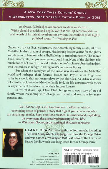 A New York Times Editors' Choice A Washington Post "Notable Fiction Book of 2015" "[A] lavishly detailed historical novel that doesn't just recreate the past but alters your perception of it."--New York Times Book Review "As always, [Clark's] environments are deliciously luxe. . . With splendid breadth and depth, We That Are Left accommodates an era's worth of historical reverberations within the confines of its highly polished rooms."--Washington Post Growing up at Ellinghurst, their crumbling family estate, all three Melville children dream of escape. Headstrong Jessica yearns for the glitter and glamor of London while Phyllis longs to attend university. The adored Theo, meanwhile, eclipses everyone around him. None of the children take much notice of Oskar Grunewald, their mother's science-obsessed godson, who instead seeks refuge in Ellinghurst's enormous library. But when the cataclysm of the Great War devastates the Melvilles' world and reshapes their futures, Jessica and Phyllis must forge new paths in a world that no longer plays by the old rules. As Oskar is drawn reluctantly back into the Melville family fold, his life entwines with theirs in ways that will transform all of their futures forever. In We That Are Left, Clare Clark brings us a new story of an old family whose reckoning with change will haunt and resonate for many generations. "We That Are Left is still haunting me. It offers an utterly convincing sense of period; a story that tugs at you; characters who are surprising, tender, hurt; emotions crushed, misunderstood, exploding; on every page the unresolved intensity of real life."--William Nicholson, author of Lovers of Amherst
