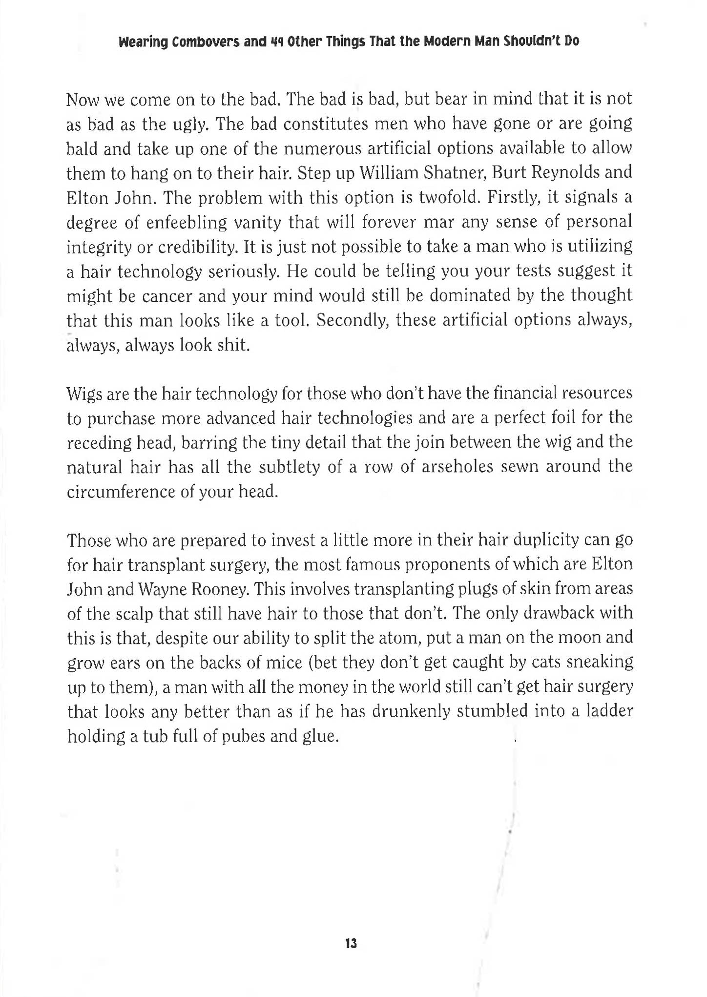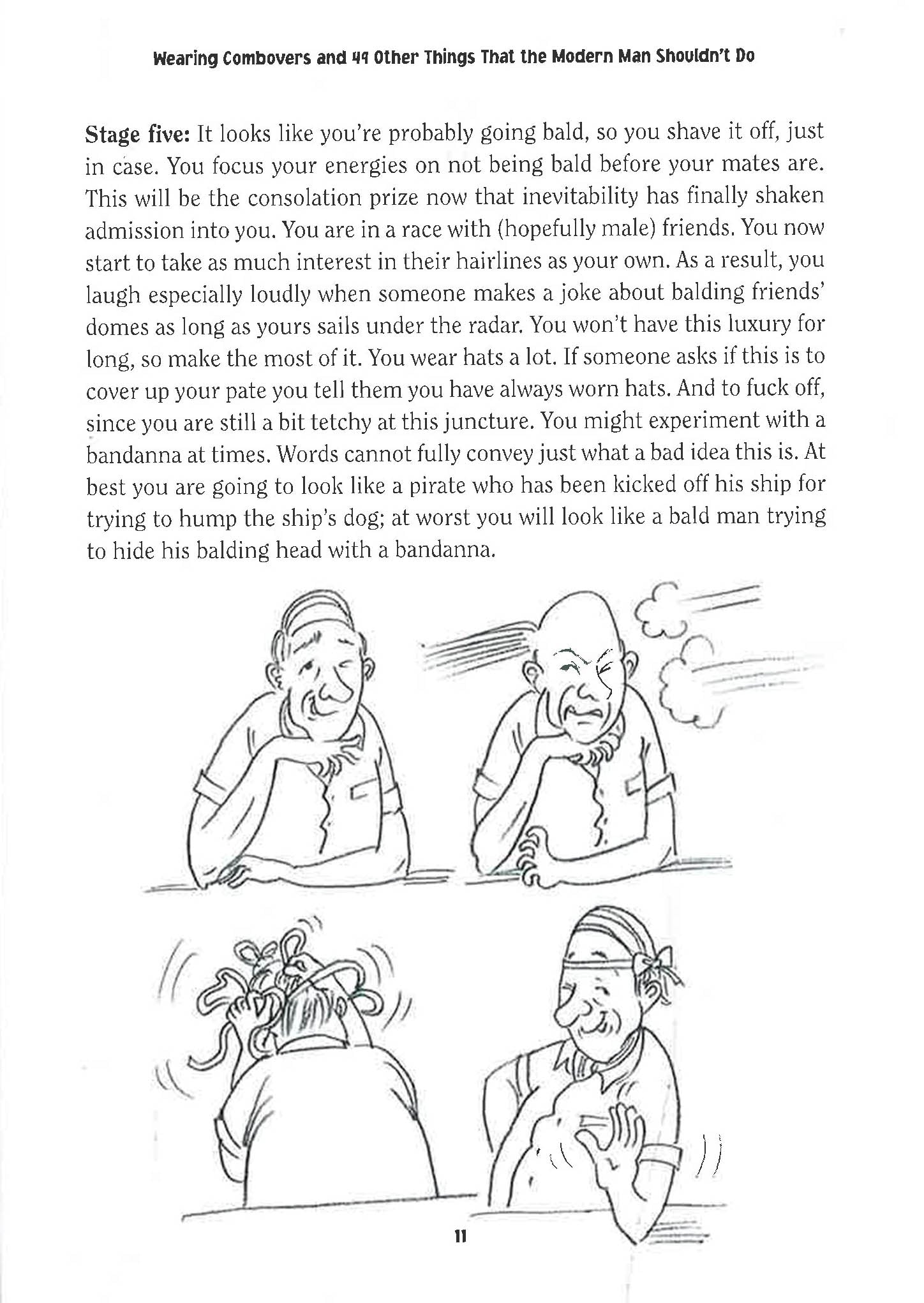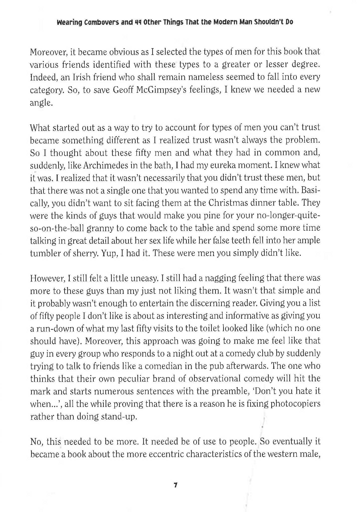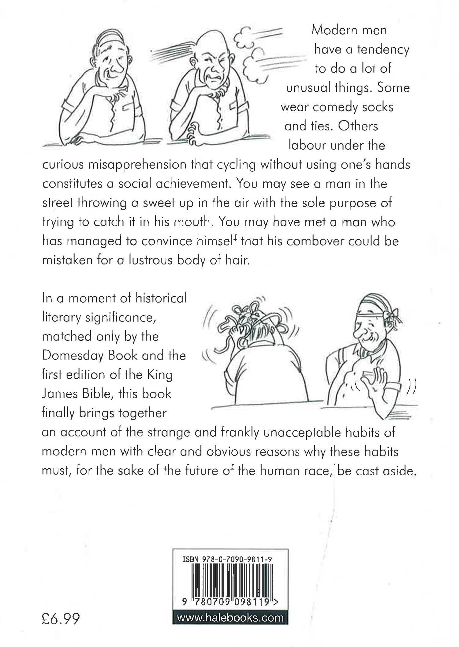 Modern men have a tendency to do a lot of unusual things. Some wear comedy socks and ties. Others labour under the curious misapprehension that cycling without using ones hands constitutes a social achievement. You may see a man in the street throwing a sweet up in the air with the sole purpose of trying to catch it in his mouth. You may have met a man who has managed to convince himself that his combover could be mistaken for a lustrous body of hair. In a moment of historical literary significance matched only by the Doomsday book and the first edition of the King James Bible, this book finally brings together an account of the strange and frankly unacceptable habits of modern men with the clear and obvious reasons why these habits must, for the sake of the future of the human race, be cast aside.