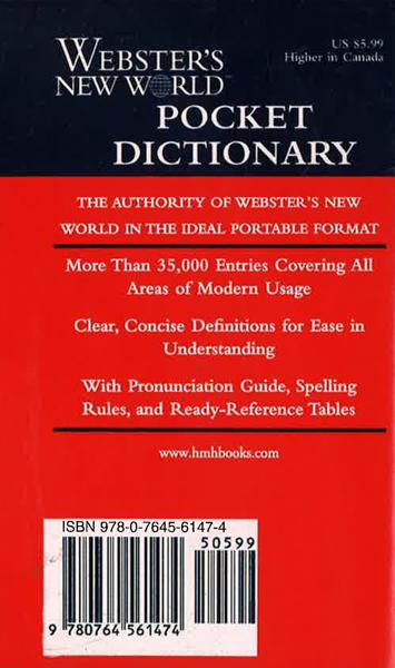 Completely revised and enlarged based on the recent Fourth Edition of Webster's New World Pocket Dictionary, this perennial bestseller now includes more than 37,000 entries. Clear, concise definitions instantly provide reliable information about thousands of terms and meanings in every area of contemporary language. Updated reference supplements make this the most readable and useful pocket dictionary available today. *This book may have remainder mark*