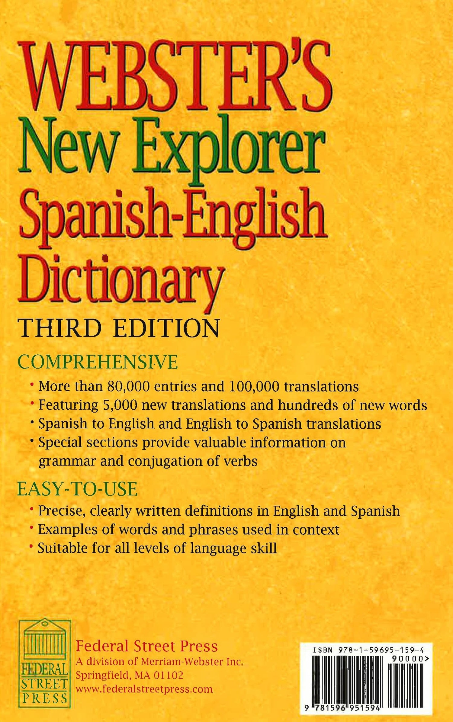Webster's New Explorer Spanish-English Dictionary, Third Edition This fully revised and updated edition provides accurate, up-to-date coverage of the current core vocabulary of American English and Latin-American Spanish. Ideal for teachers, learners, travelers and businesspeople at all skill levels, it is an essential reference for anyone who needs to communicate effectively in Spanish and English as they are spoken and written in the Americas today. Features of this Book More than 80,000 words and phrases with over 100,000 translations Bidirectional - Spanish to English and English to Spanish Concise clearly written definitions Thousands of examples of words and phrases in context Special sections cover Spanish grammar, irregular English verb