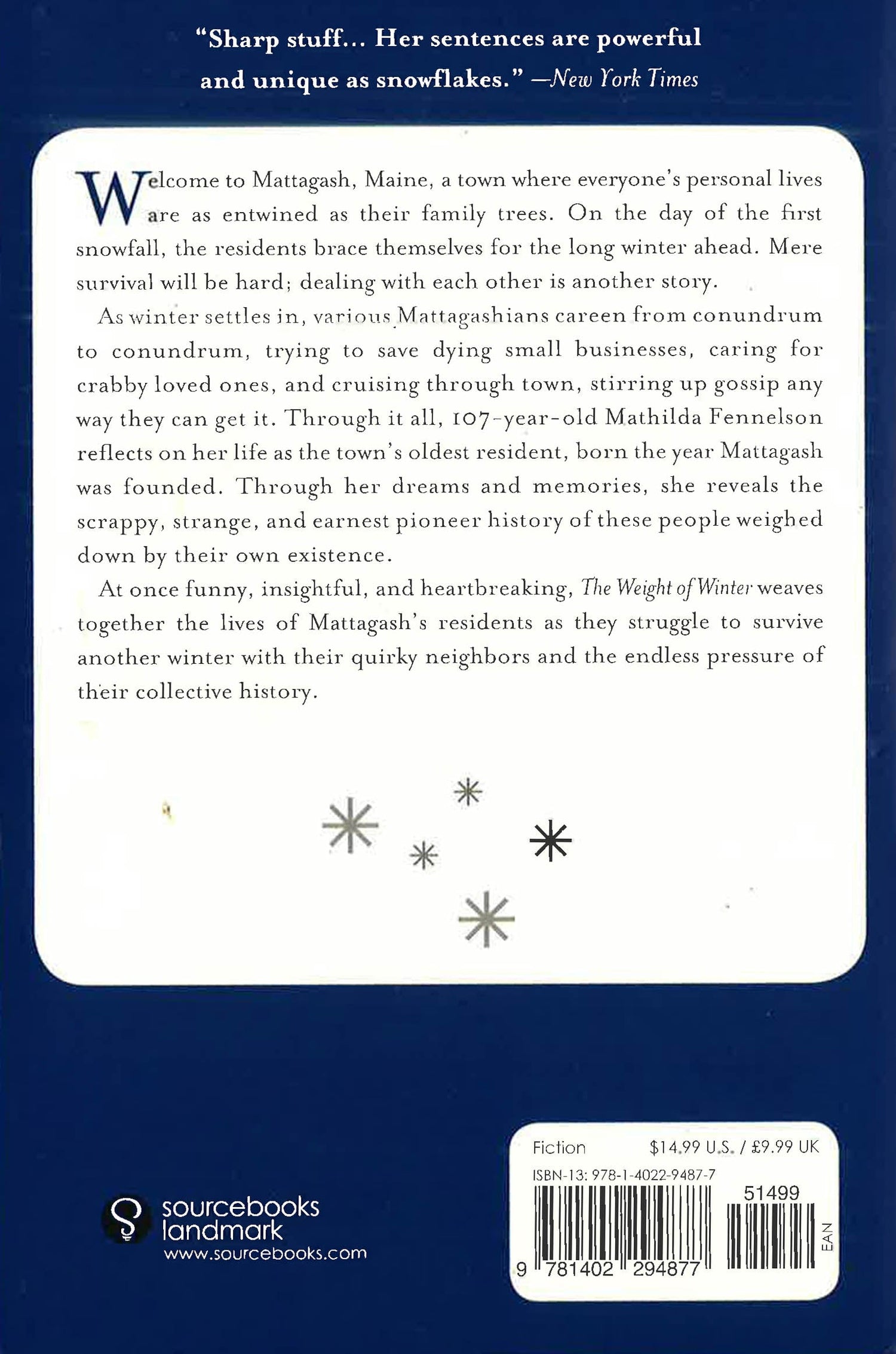 At once funny, insightful, and heartbreaking, The Weight of Winter is a perfect for fans of Olive Kitteridge (Elizabeth Strout), The Language of Flowers (Vanessa Diffenbaugh), and The Good House (Ann Leary) who will fall in love with Mattagash and its people.