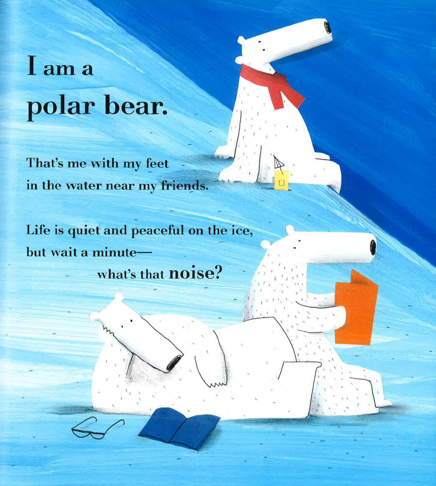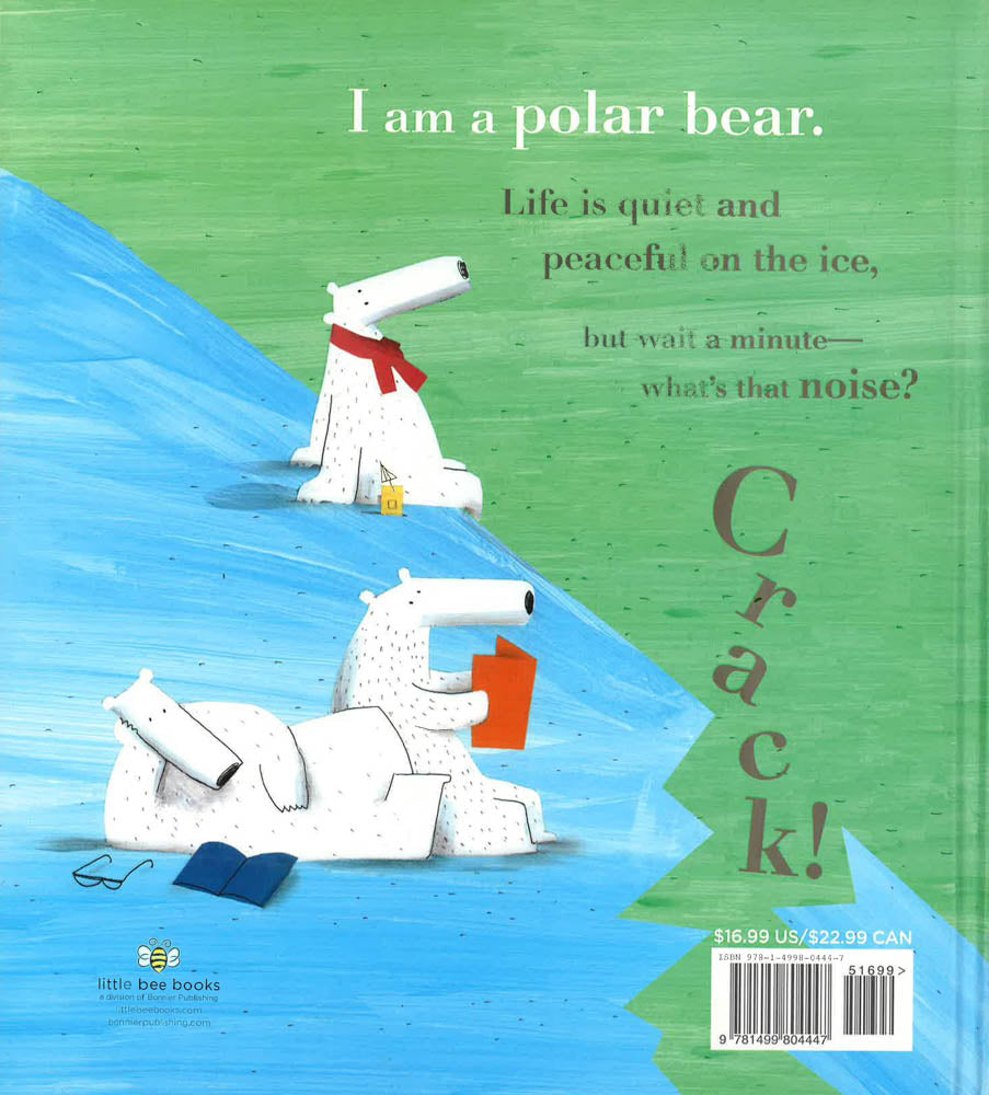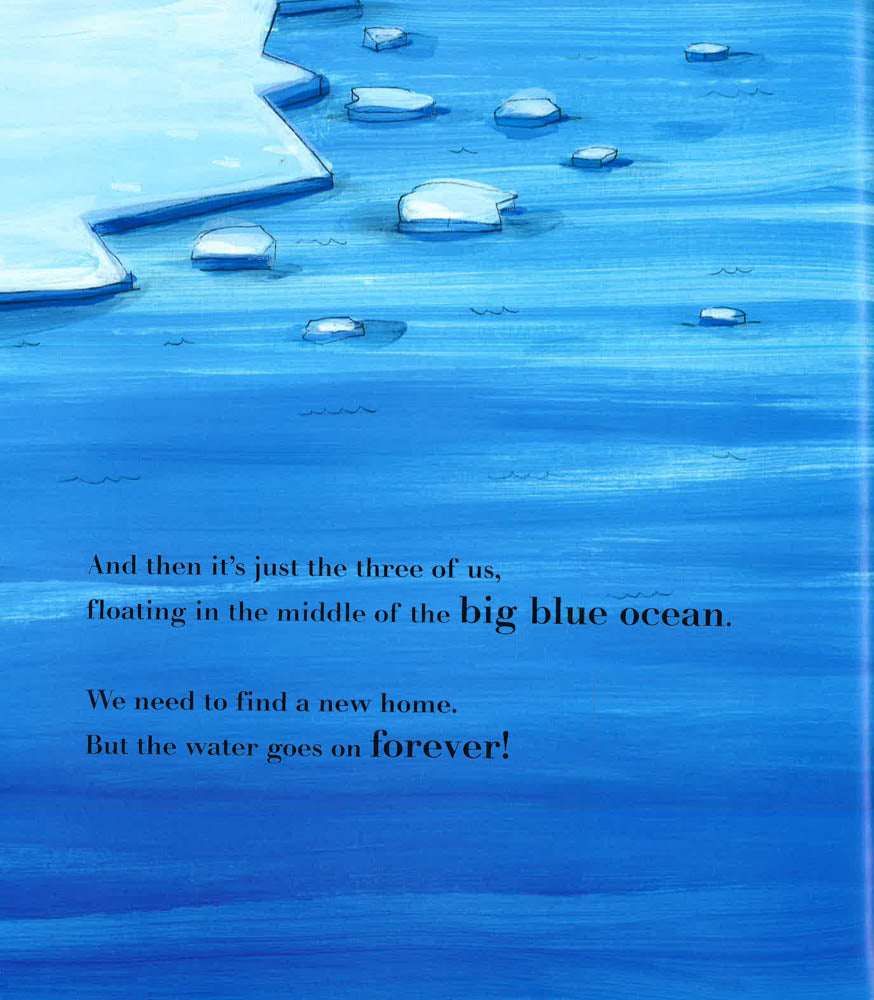 Life is quiet and peaceful on the ice for three polar bears, until, "CRACK!" The ice breaks, and they drift away. The sea is dangerous, so they need to search for a new home. Then, the polar bears see it . . . Land! They're saved! But the cows there think they are too furry, bearish, and tall, so they don't let them live there. The panda says there's no room on his island (though there clearly is!), and the giraffes pretend not to hear. All the while, their ice floe is getting smaller and smaller until they come to an empty island. A new home, all to themselves! That is, until three lost monkeys who are looking for a new home come along. The bears think about it, and say that they are welcome!