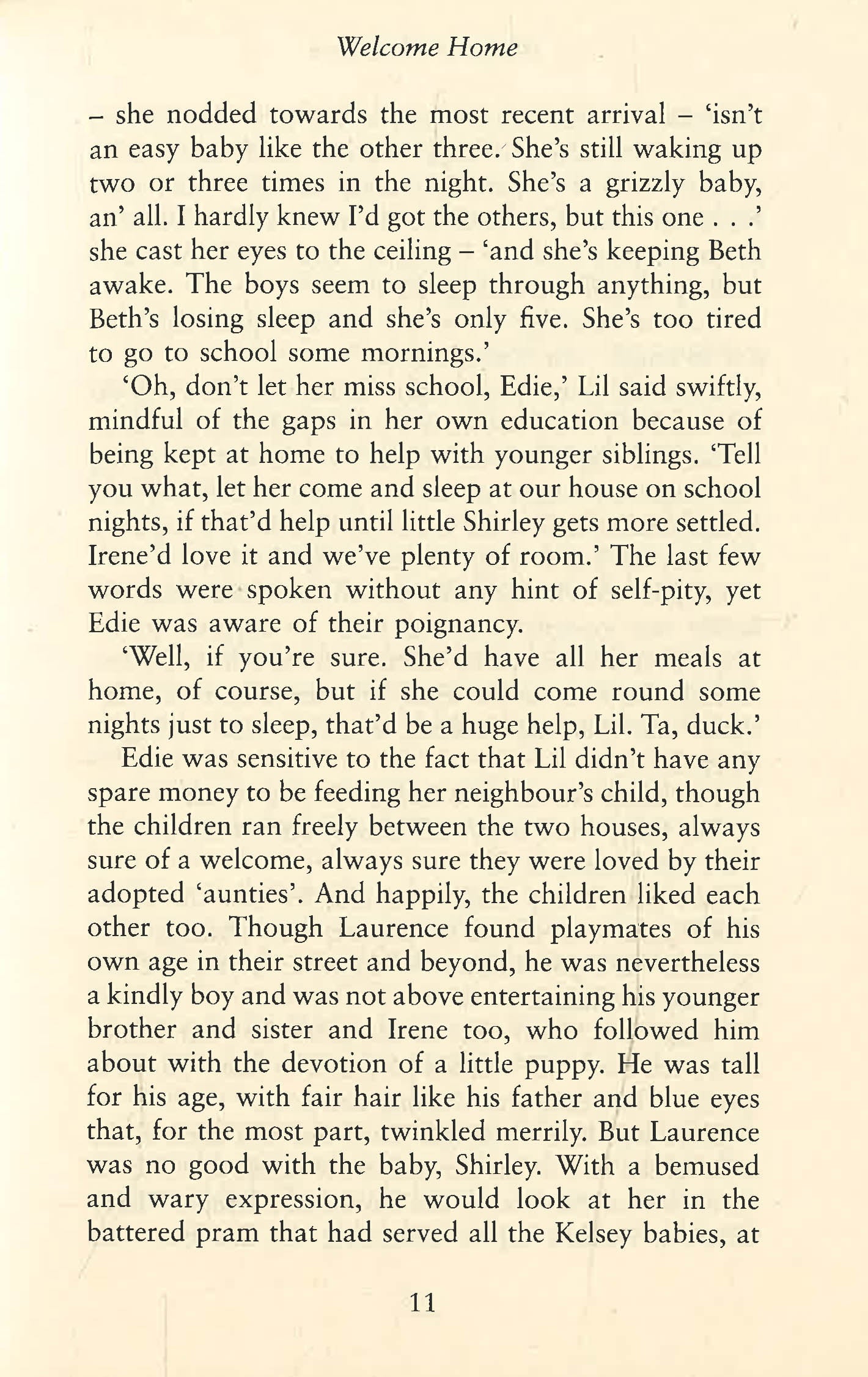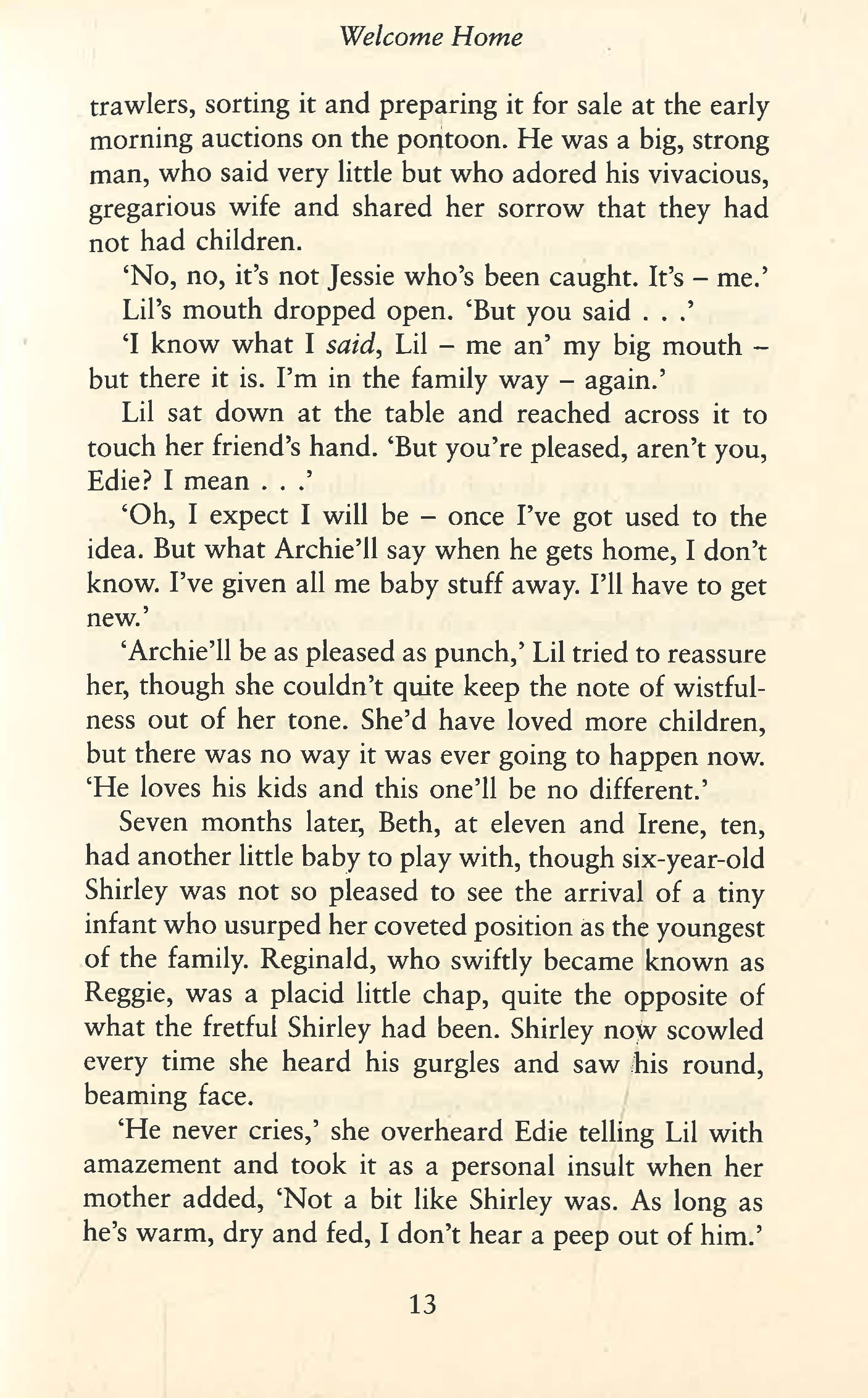 There are some things which even the closest friendship cannot survive . . . Welcome Home is an enthralling and moving drama from bestselling author Margaret Dickinson, set during the Second World War.Neighbours Edie Kelsey and Lil Horton have been friends for over twenty years, sharing the joys and sorrows of a tough life as the wives of fishermen in Grimsby. So it was no surprise that their children were close and that Edie's son, Frank, and Lil's daughter, Irene, would fall in love and marry at a young age.But the declaration of war in 1939 changed everything. Frank went off to fight, and Irene and baby, Tommy, along with Edie's youngest son are sent to the countryside for safety. With Edie's husband, Archie, fishing the dangerous waters in the North Sea and daughter Beth in London doing 'important war work', Edie's family is torn apart.Friendship sustains Edie and Lil, but tragedy follows and there's also concern that Beth seems to have disappeared. But it is Irene's return, during the VE day celebrations, that sends shock waves through the family and threatens to tear Edie and Lil's friendship apart forever.