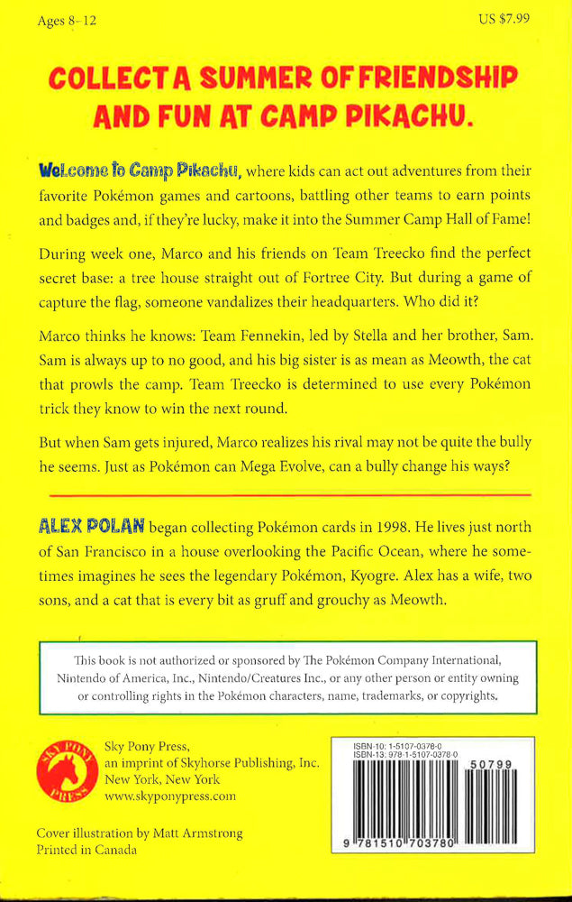 Welcome to Camp Pikachu, where kids can act out adventures from their favorite Pokémon games and cartoons, battling other teams to earn points and badges and, if they're lucky, make it into the Summer Camp Hall of Fame! During their first week at Camp Pikachu, Marco and his friends on Team Treecko find the perfect secret base: a tree house straight out of Fortree City. They proudly post their team flag out front. But during a game of capture the flag, someone vandalizes their base. Who did it? Marco thinks he knows: Team Fennekin, led by Stella and her brother, Sam. Sam is always up to no good. And his big sister is as mean as Meowth, the cat that prowls the camp. During the next round of capture the flag, Team Treecko bands together and tries every Pokémon trick they know. Logan makes mud balls and Pitfall Mats. Nisha creates a catapult inspired by Clemont. And Maddy? Well, she’d help, too, if she weren’t so busy making Poké Puffs. But when Sam gets hit by a stone mixed in with the mud balls, the game comes to a screeching halt?and Team Treecko discovers that Sam may not be quite the bully they thought he was. Just as Pokémon can Mega Evolve with Mega Stones, can a bully change his ways? Team Treecko is about to find out!