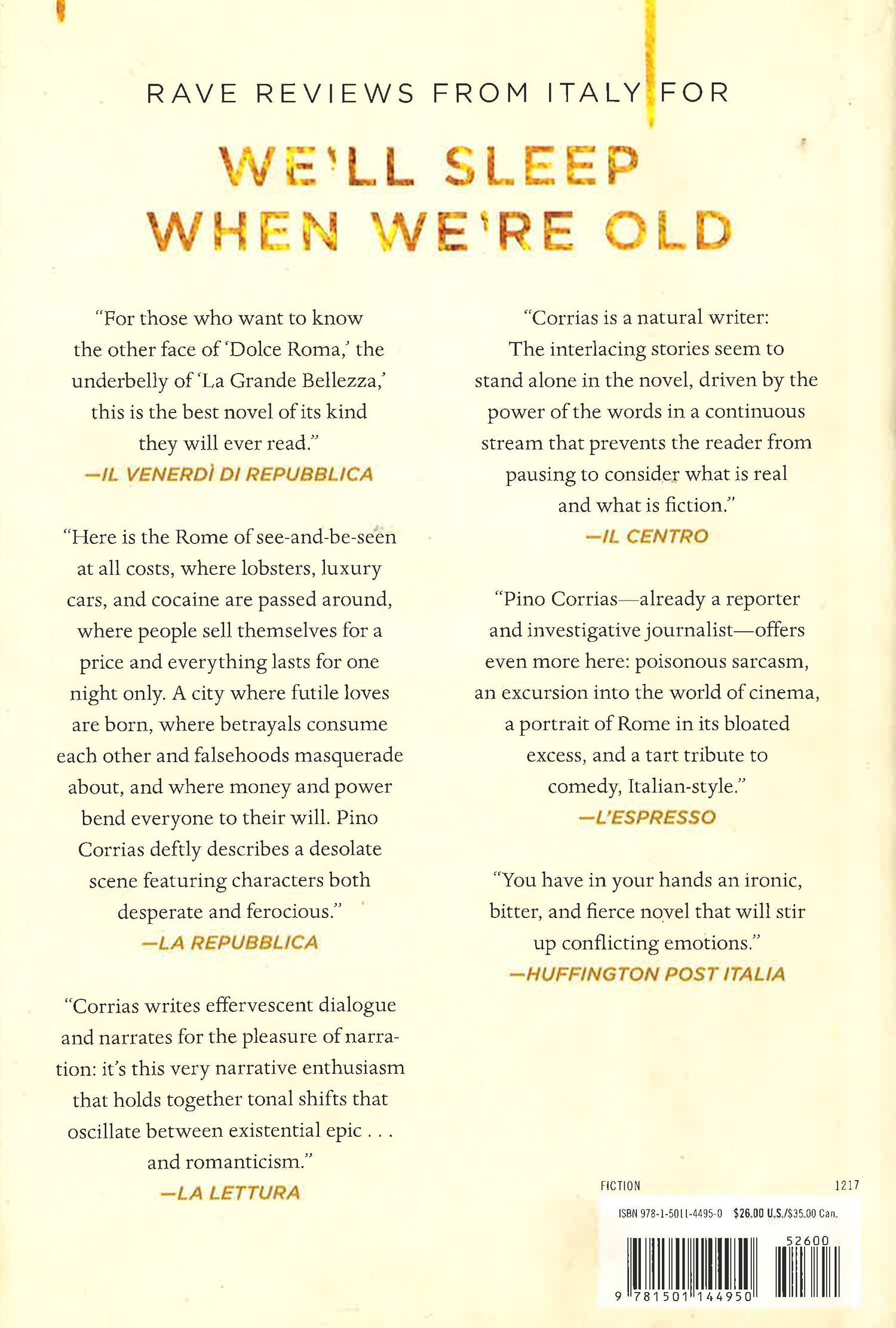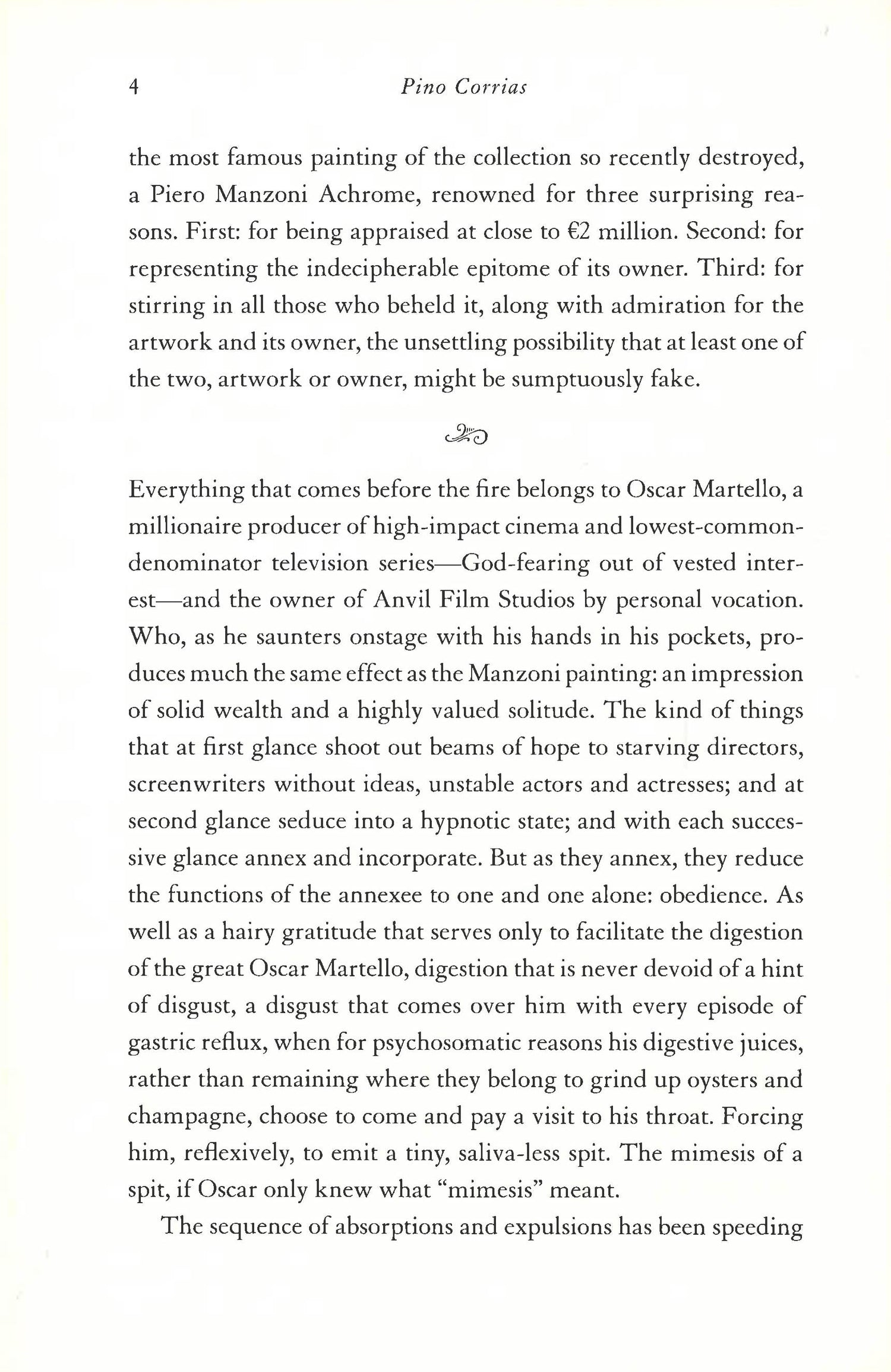 Like Fellini's classic film 81/2 and mixed with Elmore Leonard's Get Shorty, a gorgeously wrought novel that explores the complicated life of a controversial Italian film producer who vanishes after a fire destroys his home. Rome, present day: an extravagant, opulent world of fashionable parties, fancy cars, and powerful men and women in a constant dance of excess and intrigue. Oscar Martello, president of a film production company, is a self-made man: despite his humble origins, he has managed to achieve unbelievable fame and success. He is also a cutthroat and ruthless visionary. Andrea Serrano, his best friend, is a scriptwriter who explores the themes of love and murder in his work. The beautiful actress Jacaranda Rizzi, Oscar's muse, has a secret that has been tormenting her for many years. Pulsing with ambition, all three represent the apex of Rome's complex and privileged network of glamorous yet troubled aristocrats. When a fire devastates Oscar's villa in one of the city's most fashionable neighborhoods and he goes missing, all of Rome is left to wonder about his fate. The evidence points to Jacaranda, but could she have orchestrated something so sinister? More important, could she have done it alone, or has Andrea played some role in the debacle? In this archly funny, immersive, and gripping novel, Pino Corrias does for Rome what Elena Ferrante did for Naples, delivering a powerful story about the high stakes world of entertainment in today's Rome, where celebrity rules all and the grande bellezza of a more gracious age has given way to something much darker.