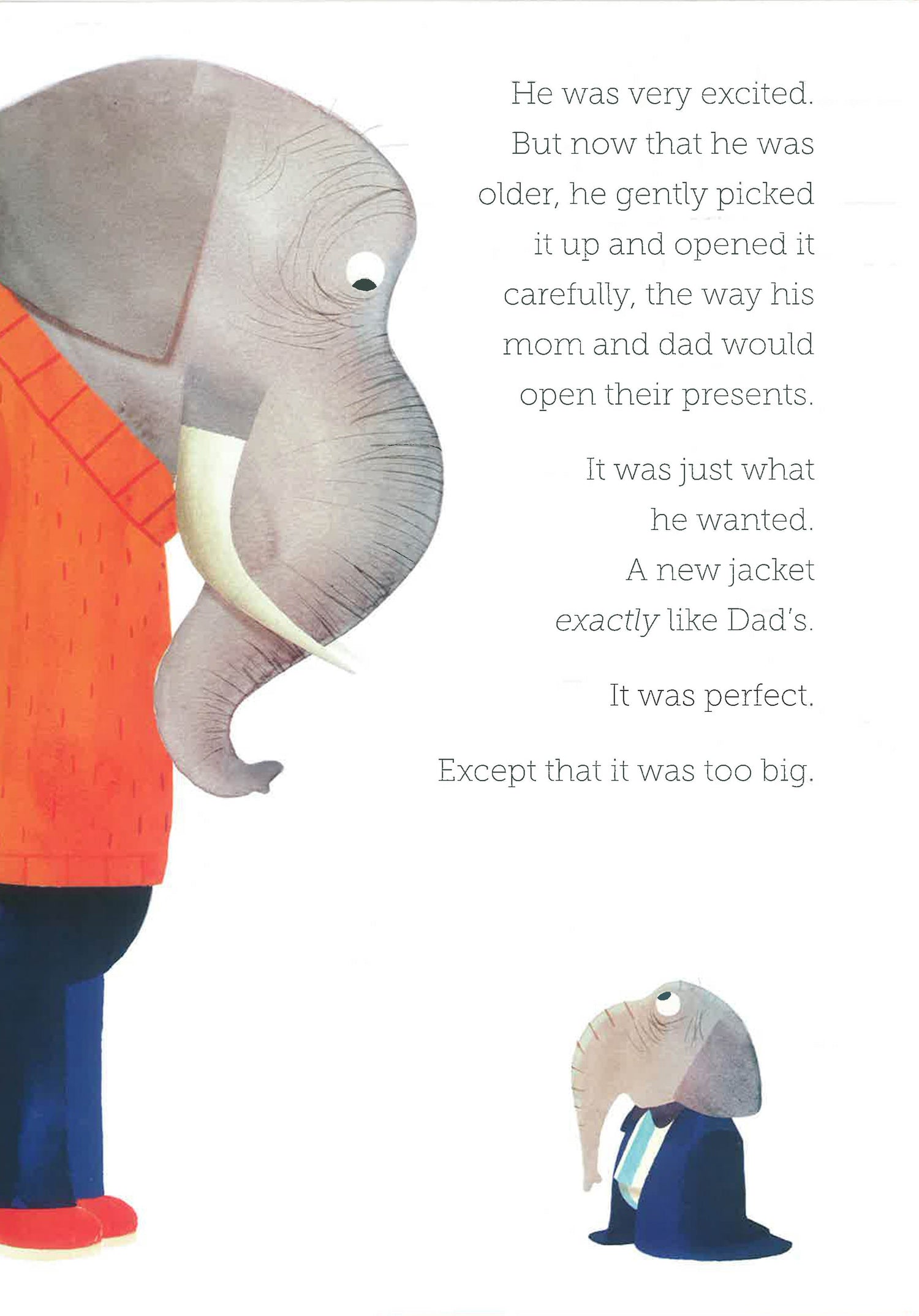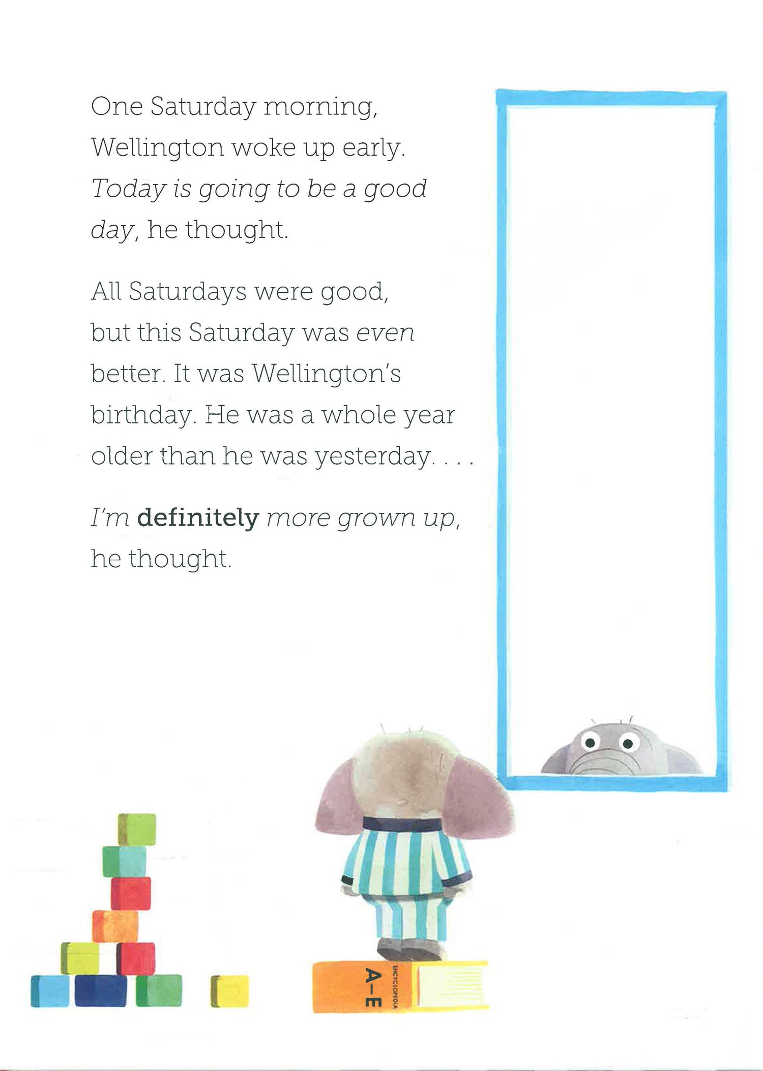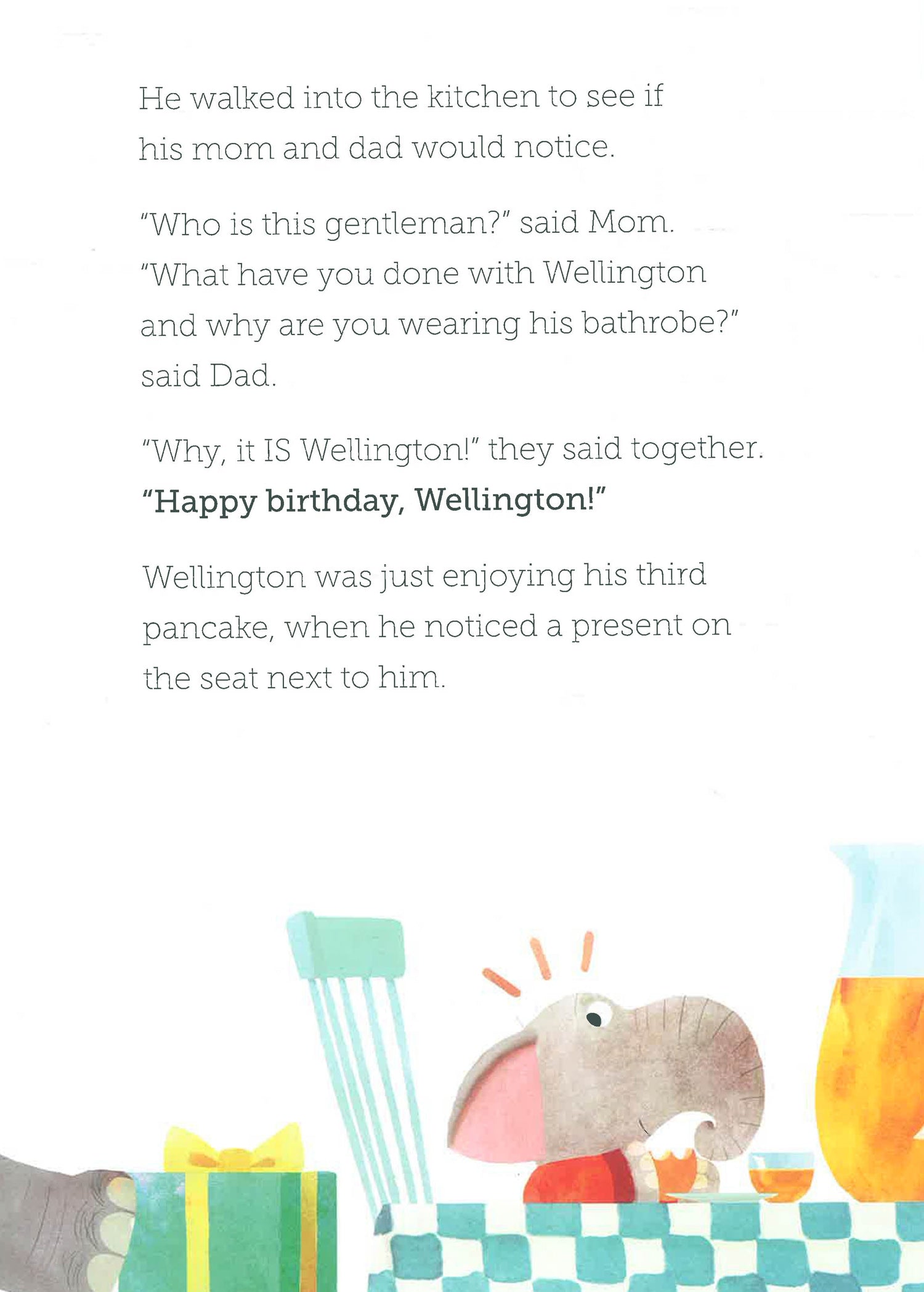 When Wellington is given a new jacket exactly like Dad’s for his birthday, he’s delighted! But his delight turns to disappointment when he tries it on and it’s far too big. Even worse, what if it’s not that the jacket is too big, but that he’s too small? Luckily, Wellington’s dad has a plan, and on an exciting day out that includes a ride on the bus, a super-size strawberry sundae, a toot on a tuba, and a visit to his granddad, Wellington learns that he’s growing up exactly as fast as he should be—and just like his dad.