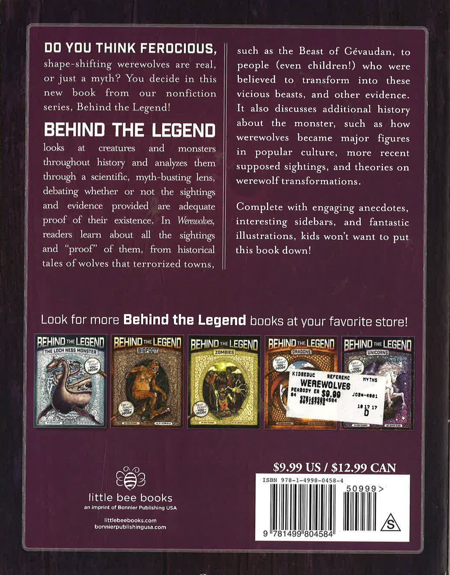 Behind the Legend looks at creatures and monsters throughout history and analyzes them through a scientific, myth-busting lens, debating whether or not the sightings and evidence provided are adequate proof of their existence. In Werewolves, readers learn about all the sightings and "proof" of them, from stories in history of wolves that terrorized towns, such as the Beast of Gévaudan, as well as people (even children!) who were believed to transform into wolves, and other evidence. It also discusses additional history about the monster, such as how werewolves became major figures in popular culture, more recent supposed sightings, and theories on werewolf transformations. Complete with engaging anecdotes, interesting sidebars, and fantastic illustrations, kids won't want to put this book down!