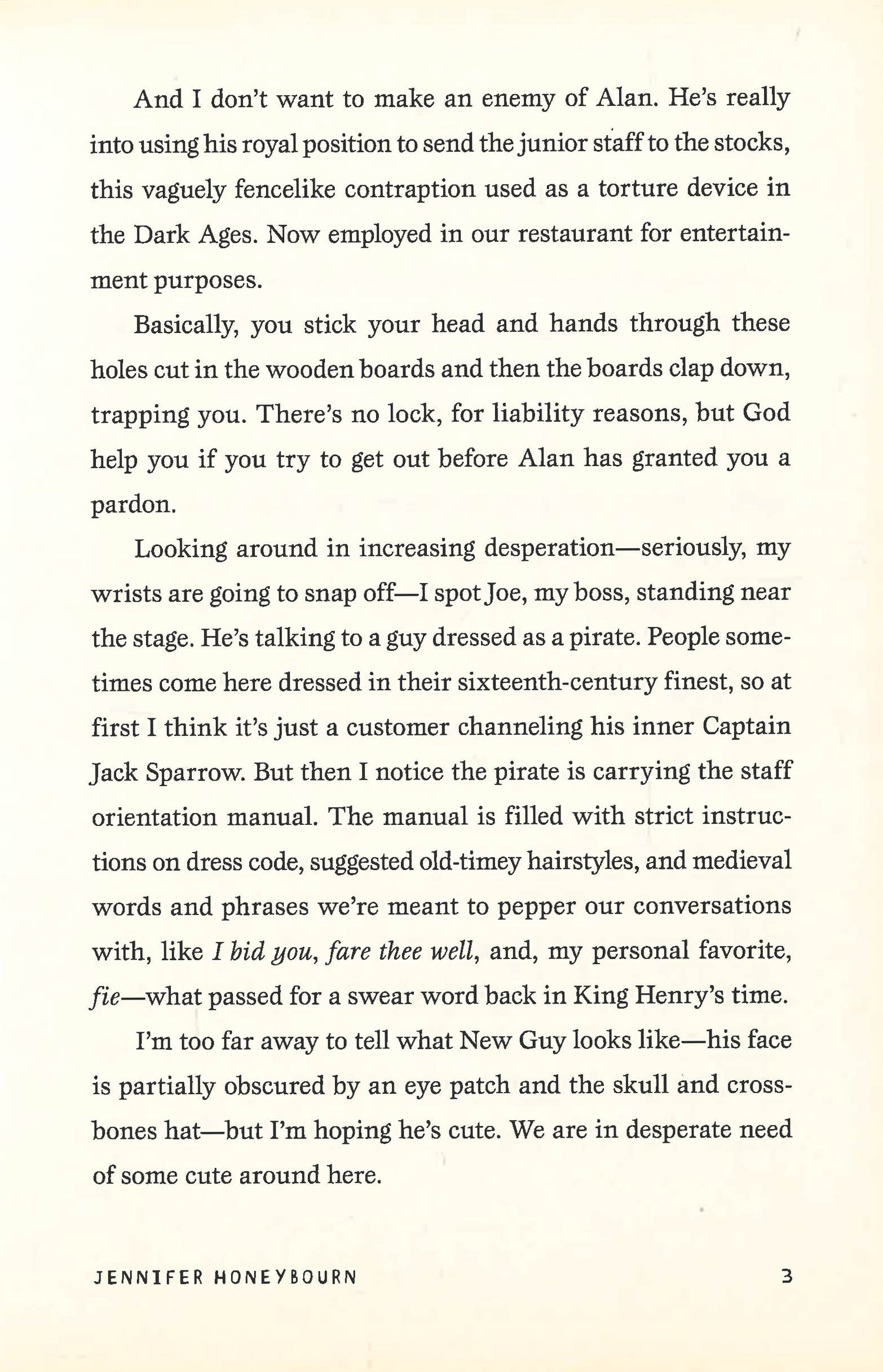Quinn is having a rough summer. Her beloved grandmother has been put into a nursing home, her dad’s gambling addiction has flared back up, and now her worst enemy is back in town: Wesley James, former childhood friend and life ruiner.So when Wesley is hired to work with her at Tudor Tymes, a medieval England-themed restaurant, the last thing Quinn’s going to do is forgive and forget. She’s determined to remove him from her life and even the score for once and for all - by getting him fired.But getting rid of Wesley isn’t as easy as she’d hoped. When Quinn finds herself falling for him, she has to decide what she wants more: to get even, or to get the boy.