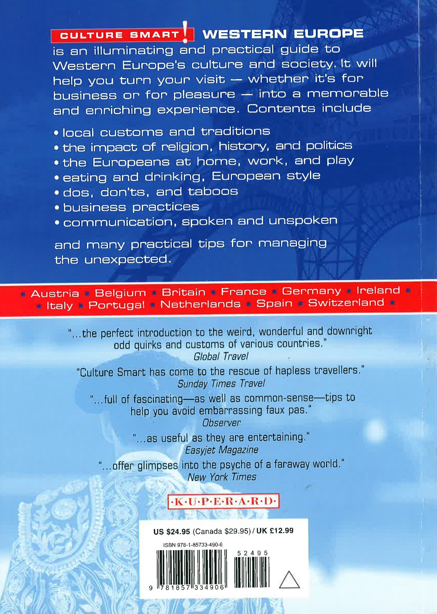 The historic countries of Western Europe Austria, Belgium, Britain, France, Germany, Ireland, Italy, Portugal, Netherlands, Spain, and Switzerland are the jewels in the crown of European civilization. Their importance and attraction for the rest of the world are so great that the region is the prime travel destination for businesspeople, tourists, and students. Western Europe is a relatively compact geographical area, containing an enormous diversity of landscapes, peoples, and cultures. The historically competitive Western Europeans are unlike each other in many ways, yet share an underlying system of values, and the restless Western European spirit of enquiry, enterprise, and adventure has had a decisive impact on world history. In the past, their empires spread their languages, religions, arts, and ideologies around the globe, and today the world beats a pathway to their doors. For foreign visitors, first encounters in Western Europe can be overwhelming. The richness and complexity of the different national cultures are difficult to take in, and people s behavior and reactions can be surprisingly unpredictable. For example, attitudes to time vary. In Germany it s rude to be late; in France it s rude to be on time. In business there is a range of negotiating styles. And because there is more to communication than speech, it is easy to misread the signals in other people s societies. Even smiling can sometimes be wrong in France it s distinctly uncool to smile at strangers. Western Europe is ideal for student travelers, businesspeople, or academics who will be visiting several countries on their trip and who don t wish to be burdened with eleven books on different destinations. In this it is unique. No other book captures the essence of eleven national cultures in a single volume. Drawing on the wealth of information in the individual Culture Smart! country guides, it focuses on those situations in each country where visitors are likely to come into contact with local people. Beyond listing the dos and don ts, it explains the cultural context of different or unexpected behavior. It tells you about beliefs and attitudes, and alerts you to local manners and sensitive issues. Full of fascinating insights and practical advice, it will help you navigate your way through uncharted seas, avoid gaffes and misunderstandings, and establish a rapport with people wherever you are."