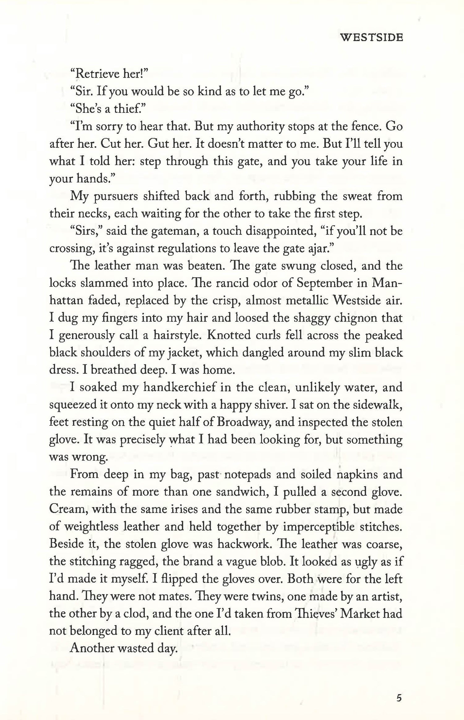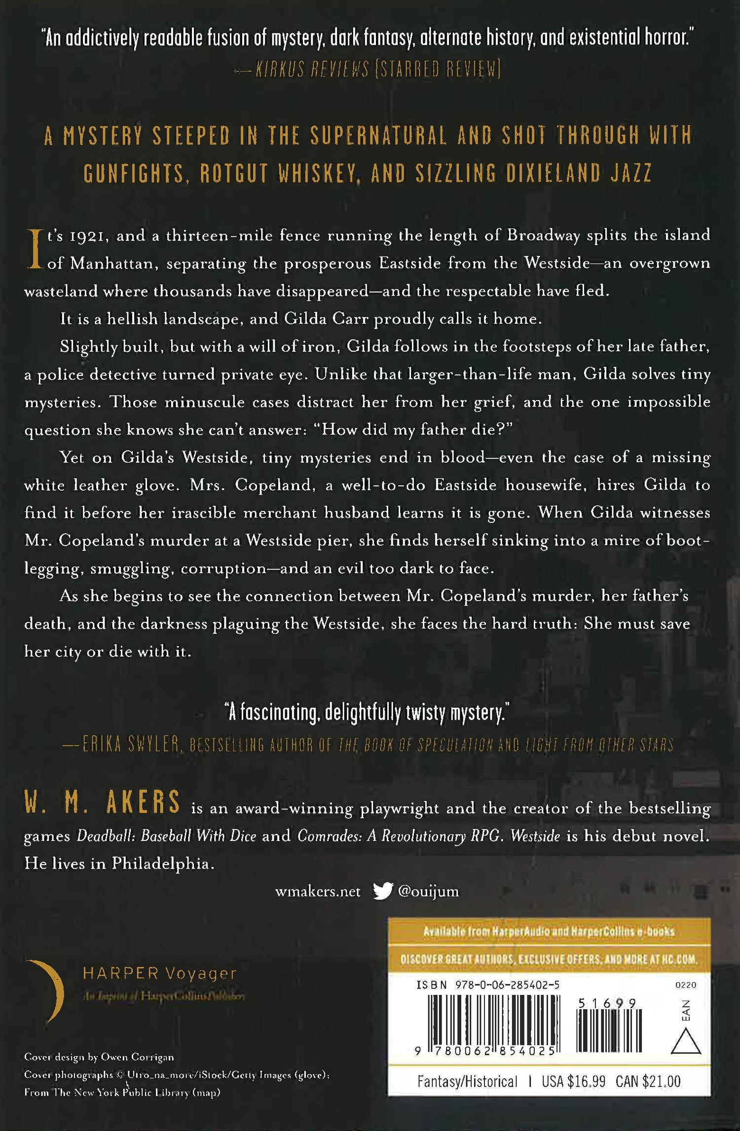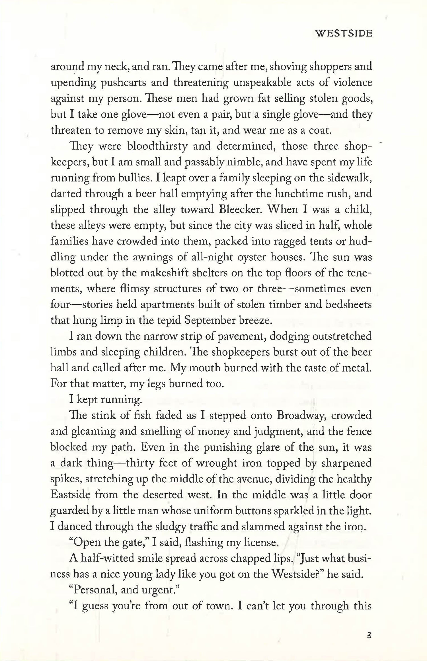 It’s 1921, and a thirteen-mile fence running the length of Broadway splits the island of Manhattan, separating the prosperous Eastside from the Westside—an overgrown wasteland whose hostility to modern technology gives it the flavor of old New York. Thousands have disappeared here, and the respectable have fled, leaving behind the killers, thieves, poets, painters, drunks, and those too poor or desperate to leave.