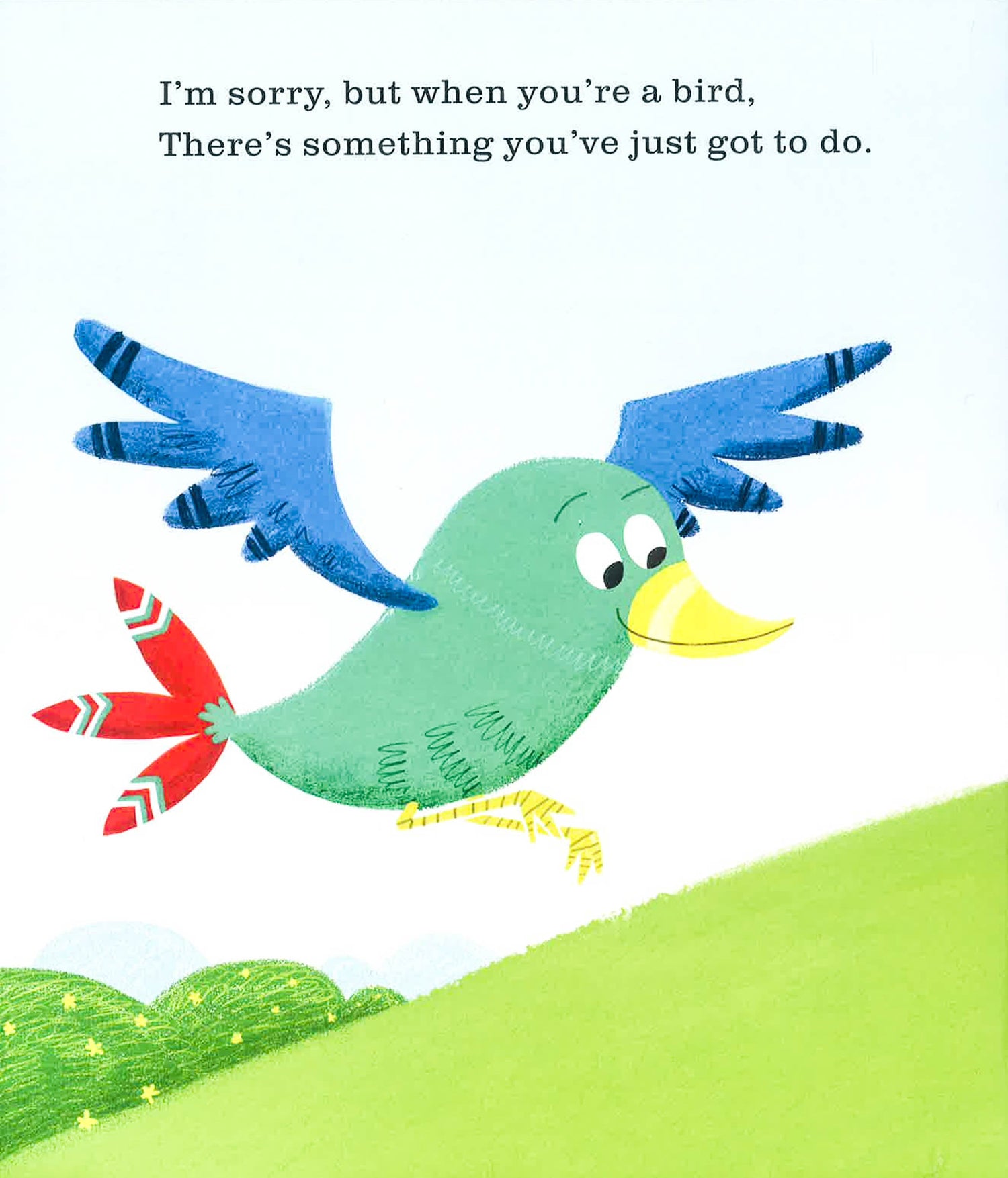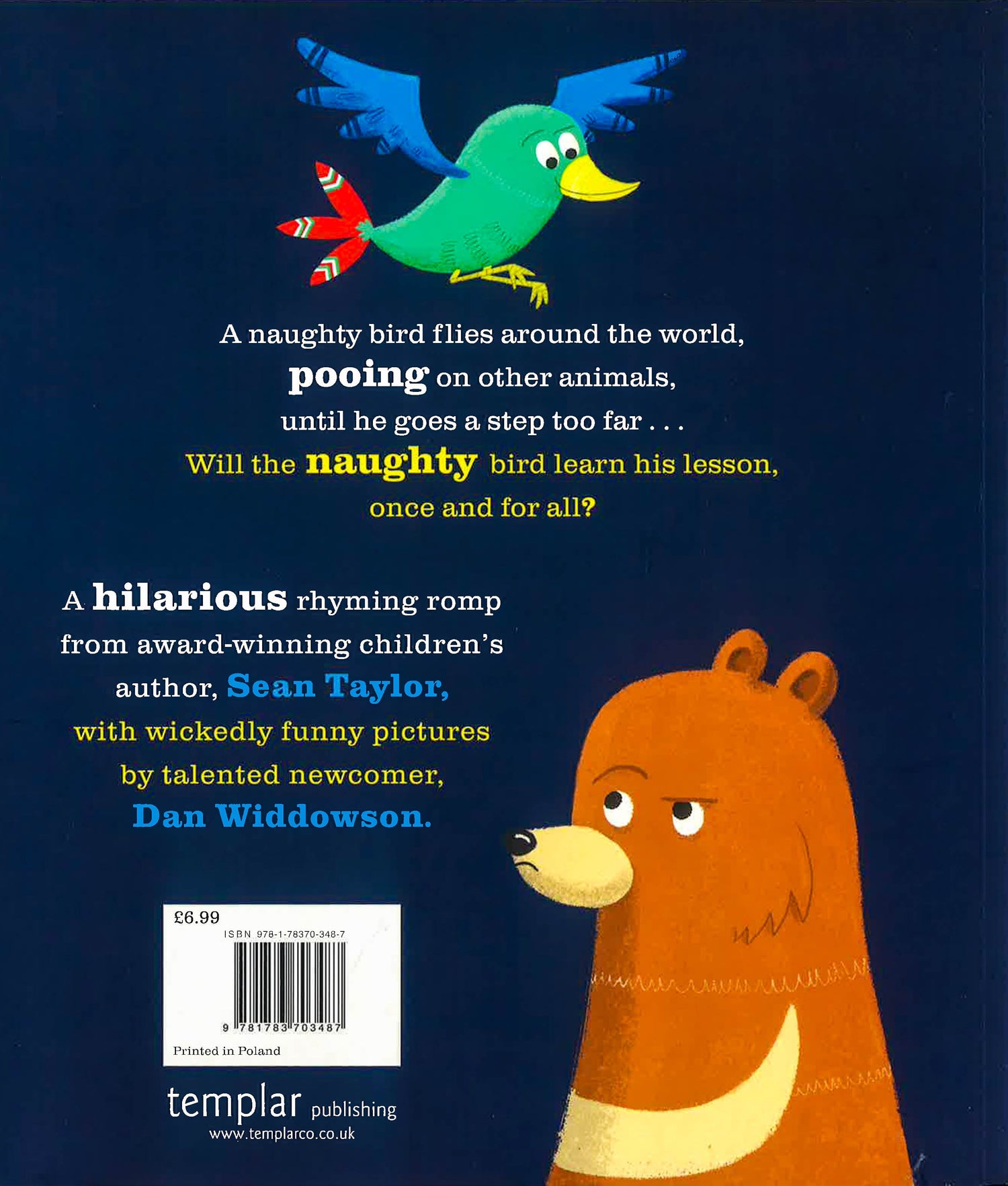 In this rhyming romp, a naughty bird flies around the world, pooing on other animals, until he goes a step too far...'The bear didn't like it, you see. And the problem is, that I forgot...A bear can climb a tree.' A hilarious, irreverent rhyming story written by storyteller and award-winning picture book author Sean Taylor.