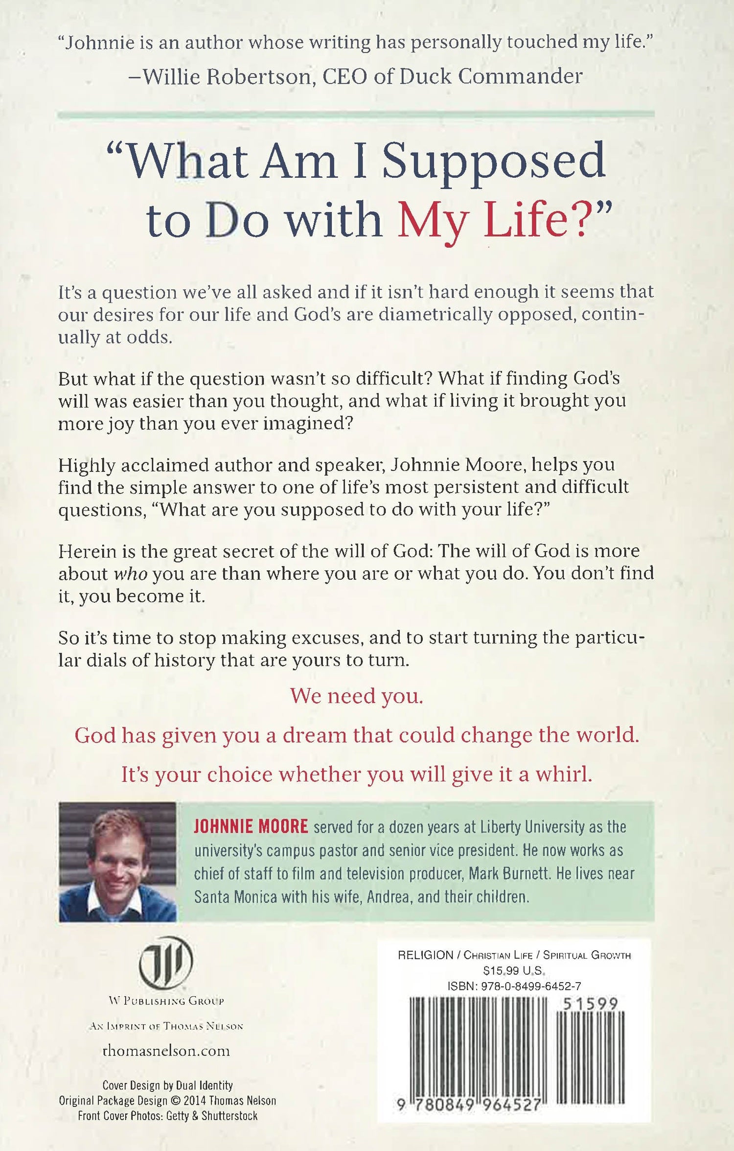 Johnnie is an author whose writing has personally touched my life. -Willie Robertson, CEO of Duck Commander "What Am I Supposed to Do with My Life? It's a question we've all asked and if it isn't hard enough it seems that our desires for our life and God's are diametrically opposed, continually at odds. But what if the question wasn't so difficult? What if finding God's will was easier than you thought, and what if living it brought you more joy than you ever imagined? Highly acclaimed author and speaker, Johnnie Moore, helps you find the simple answer to one of life's most persistent and difficult questions, "What are you supposed to do with your life? Herein is the great secret of the will of God: The will of God is more about who you are than where you are or what you do. You don't find it, you become it. So it's time to stop making excuses, and to start turning the particular dials of history that are yours to turn. We need you. God has given you a dream that could change the world. It's your choice whether you will give it a whirl.