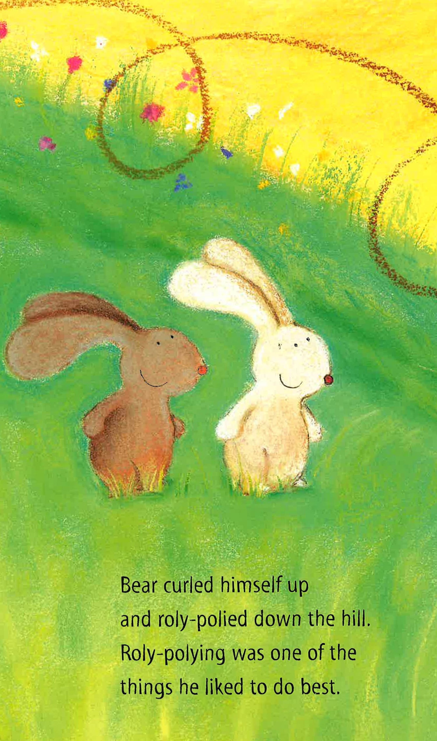 Bear is having a wonderful day. He roly-polies down the hill, splashes in the river, scratches his back and swings through the trees.