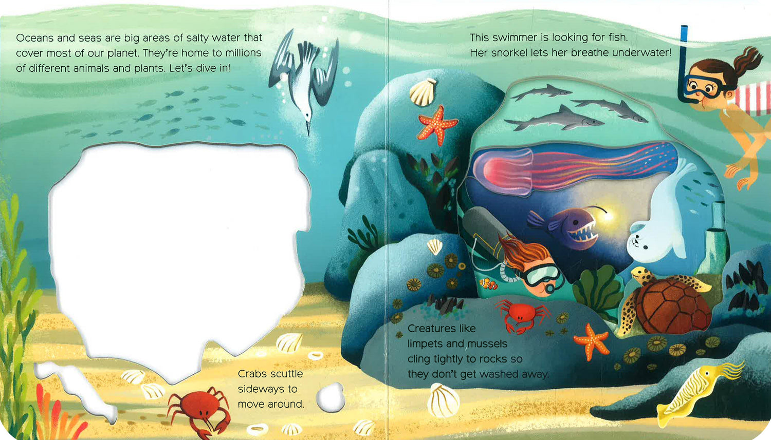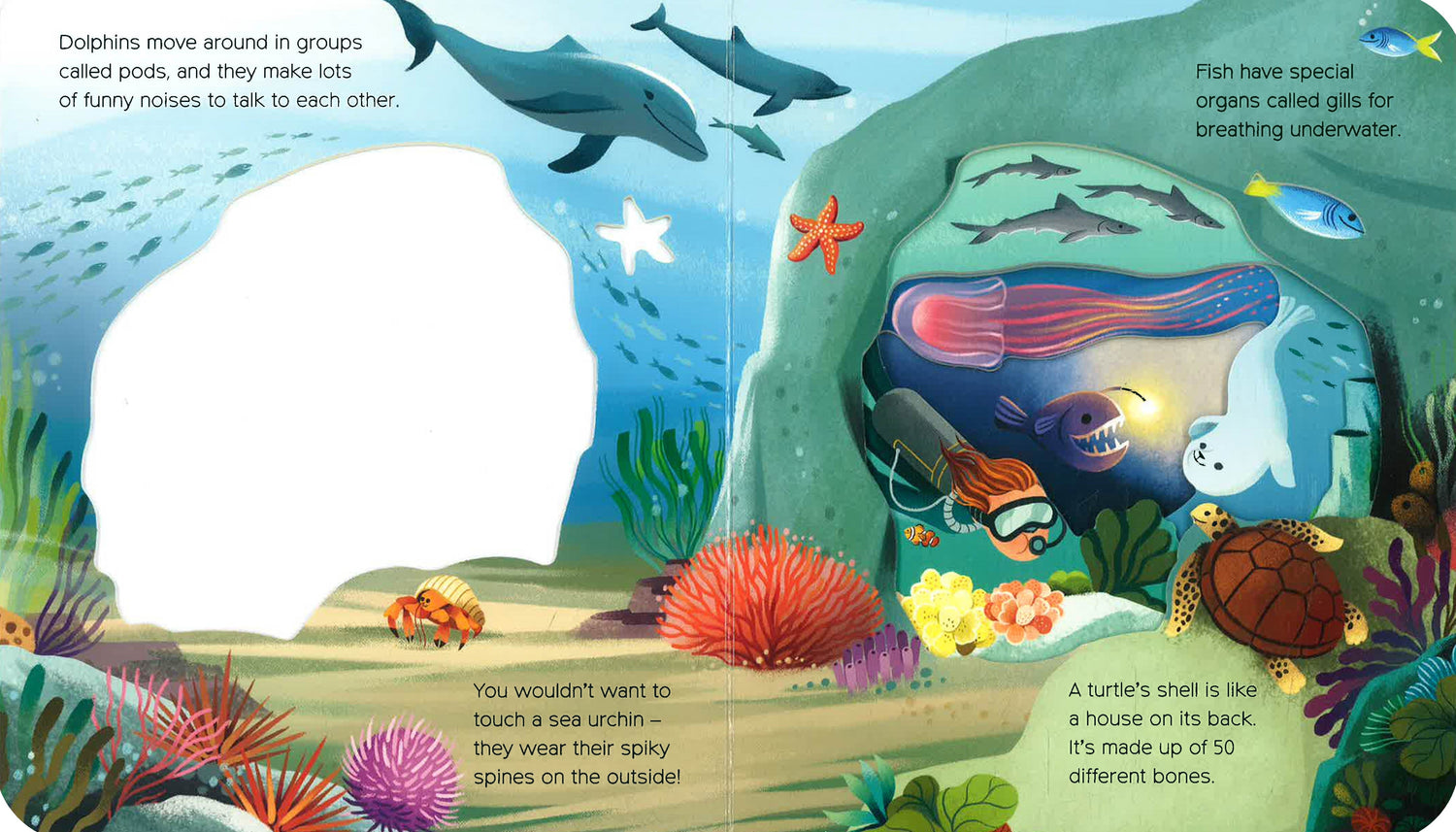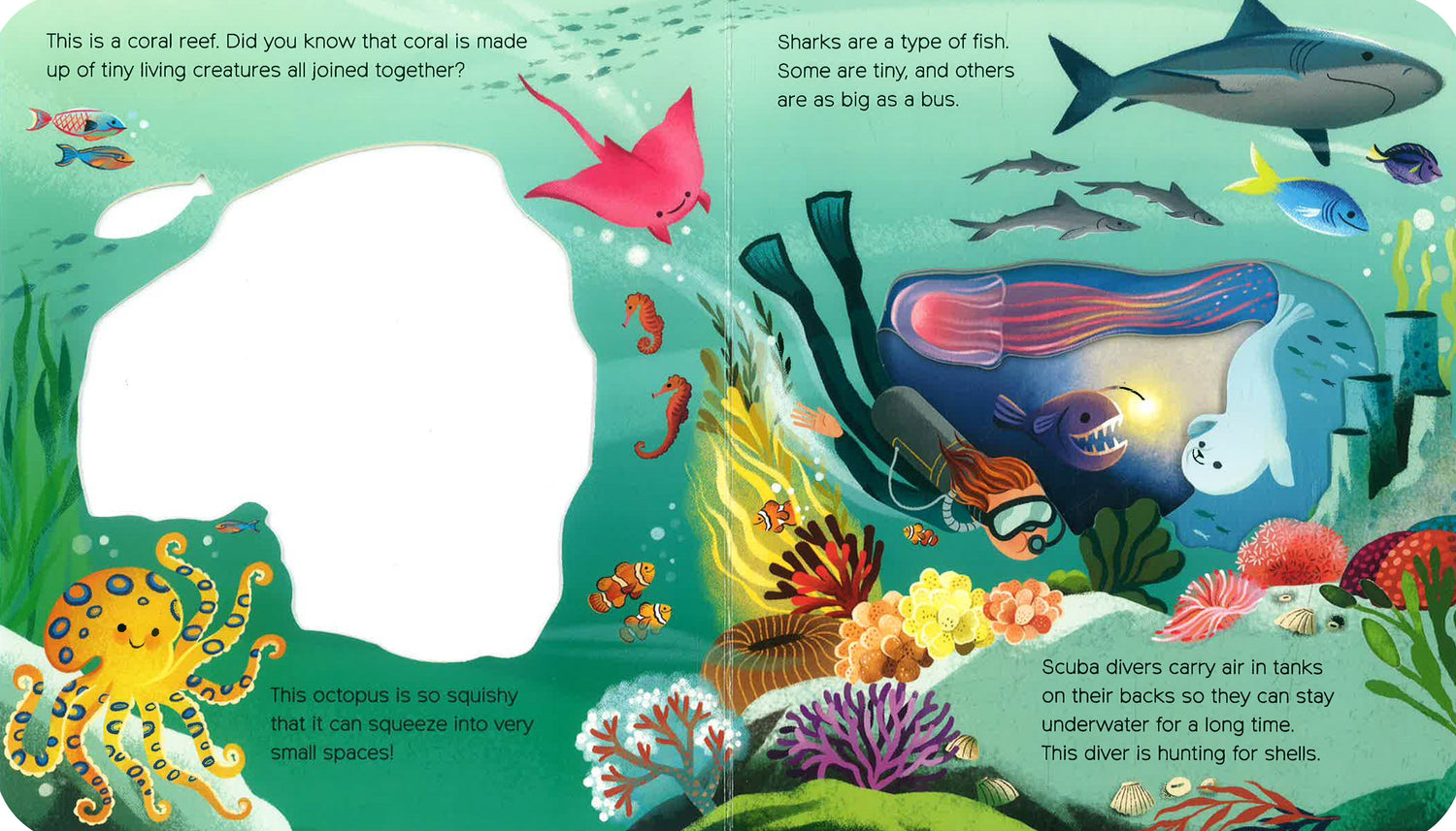 Young readers will love to peek through the pages of this layered die-cut board book to learn all about the world beneath the water!