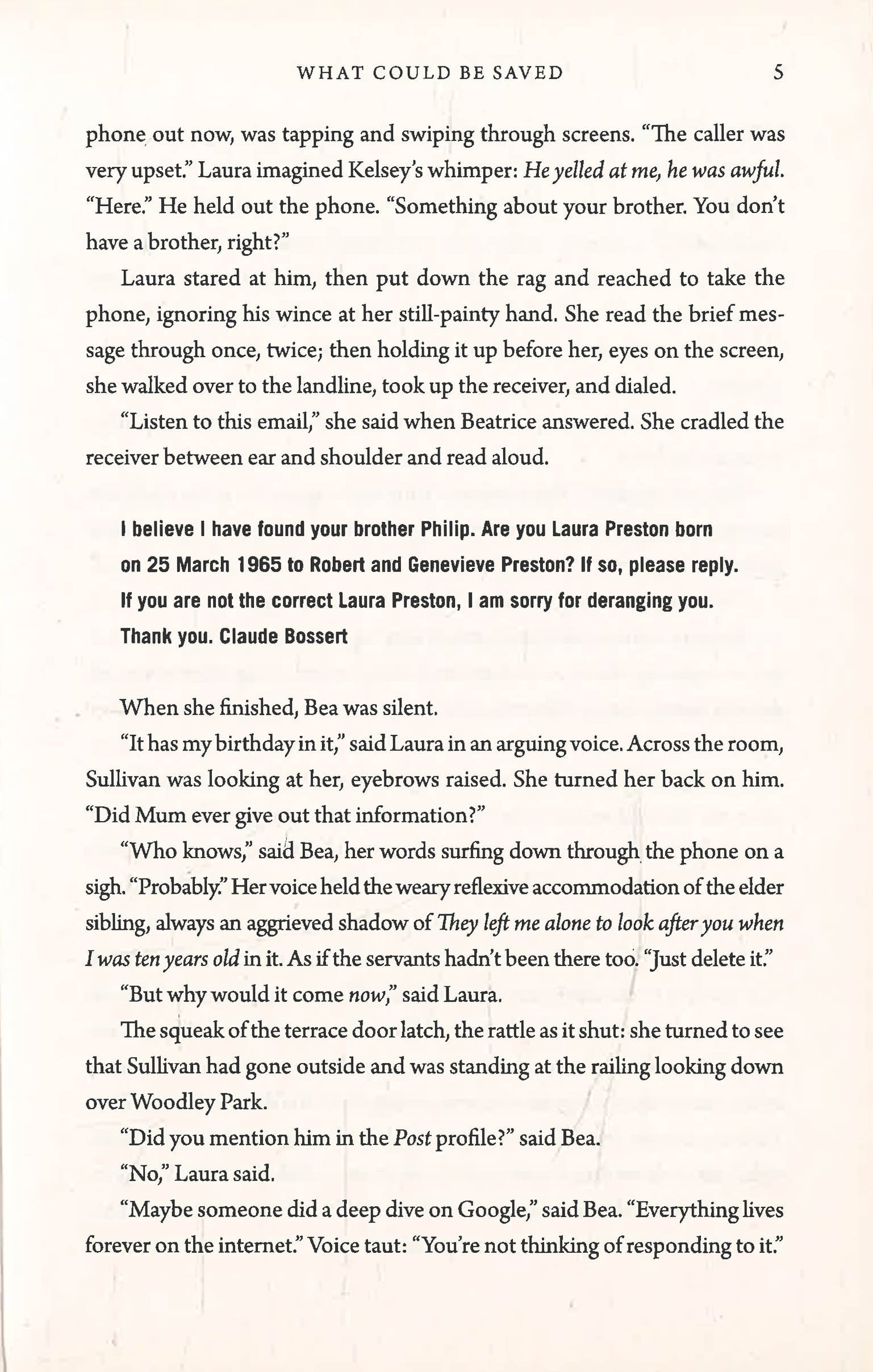 Washington, DC, 2019: Laura Preston is a reclusive artist at odds with her older sister Beatrice as their elegant, formidable mother slowly slides into dementia. When a stranger contacts Laura claiming to be her brother who disappeared forty years earlier when the family lived in Bangkok, Laura ignores Bea’s warnings of a scam and flies to Thailand to see if it can be true. But meeting him in person leads to more questions than answers.
