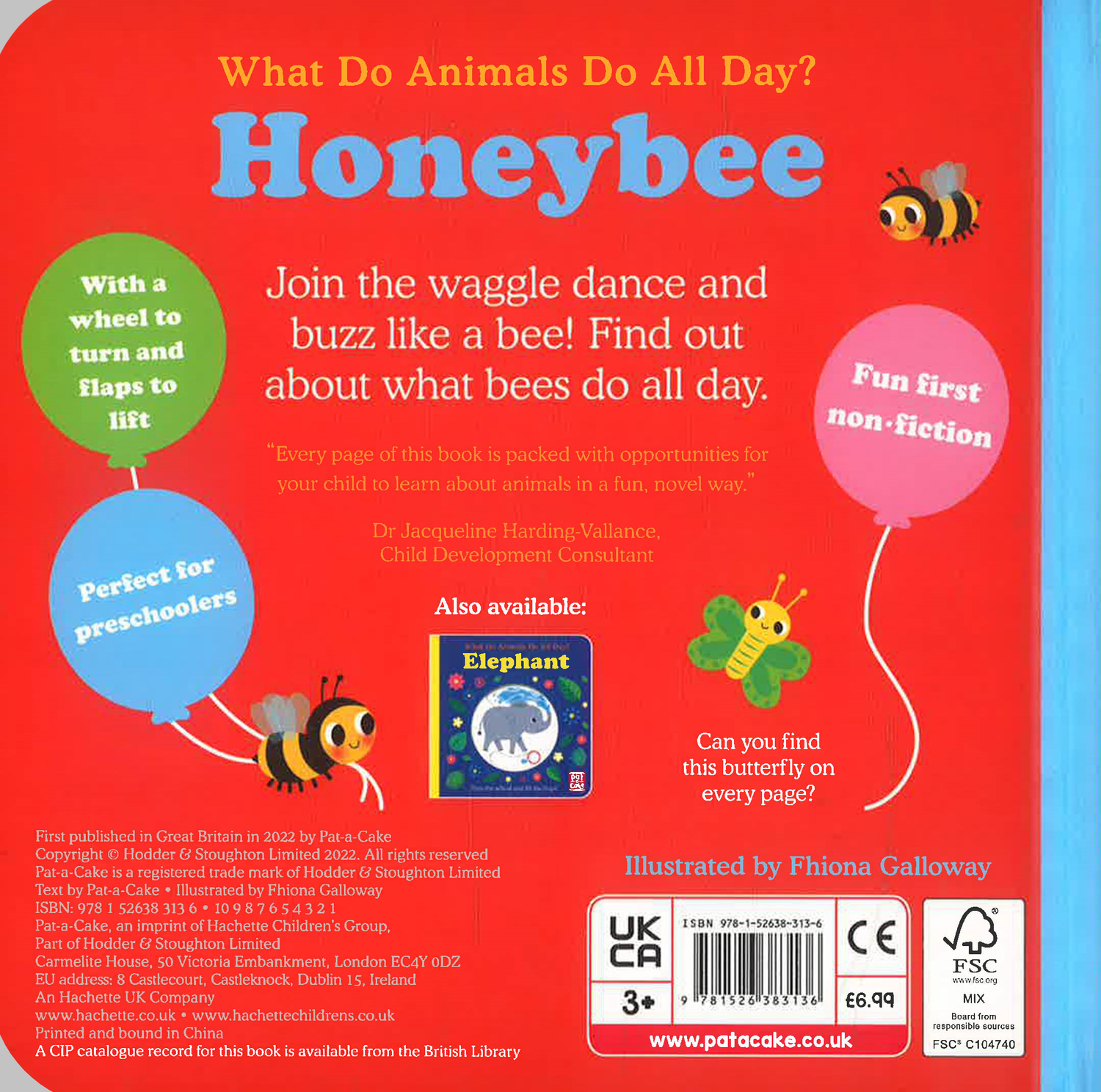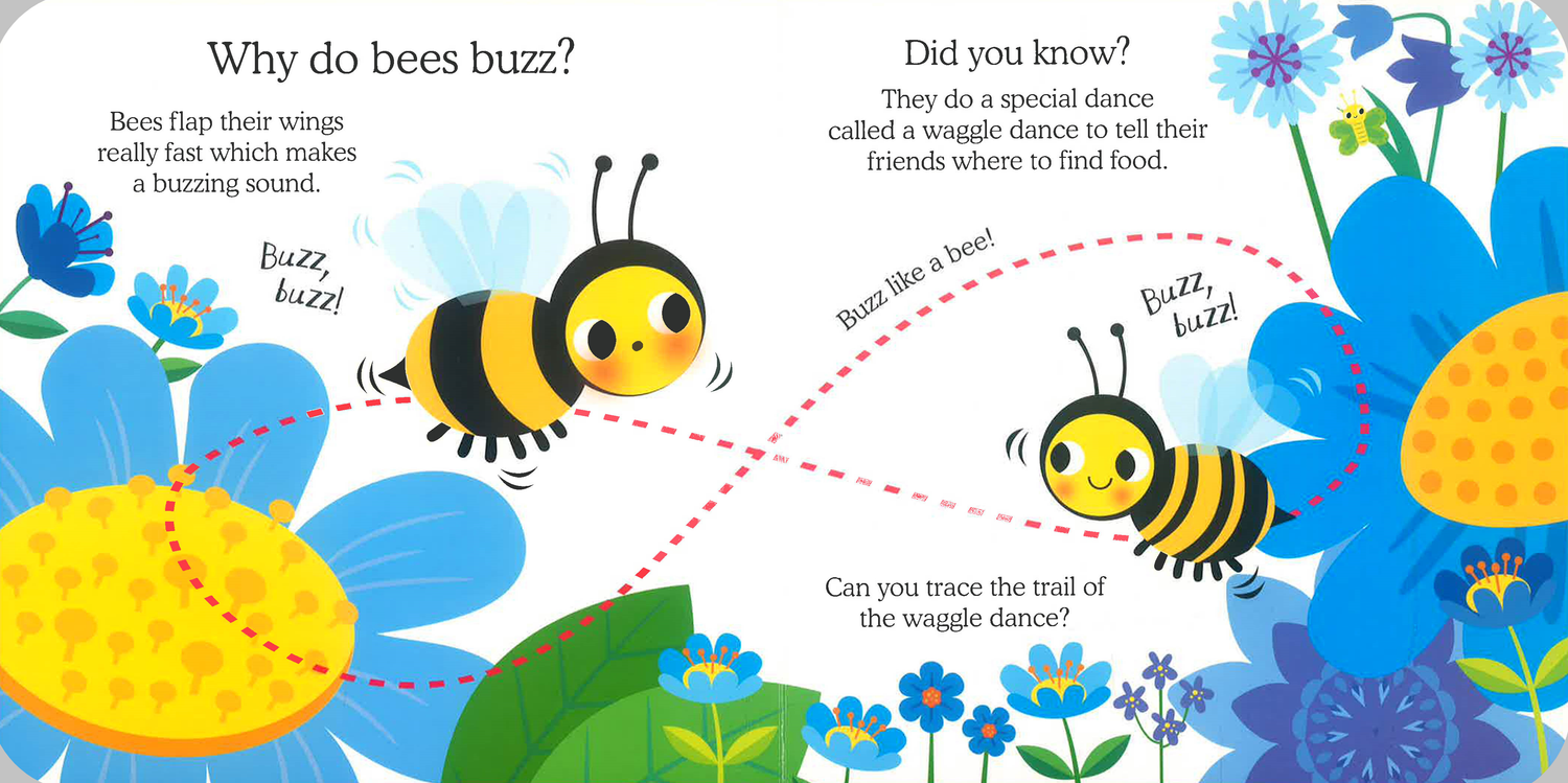 Join the busy honeybee as it goes about its daily life. Turn the wheel to wiggle the wings and learn about the different part of a bee's body, then explore a hive and follow the trail of a waggle dance. With a lift-the-flap game at the end and a fun 'Did You Know?' fact on every page, this bright, interactive book will teach little ones what bees do all day.