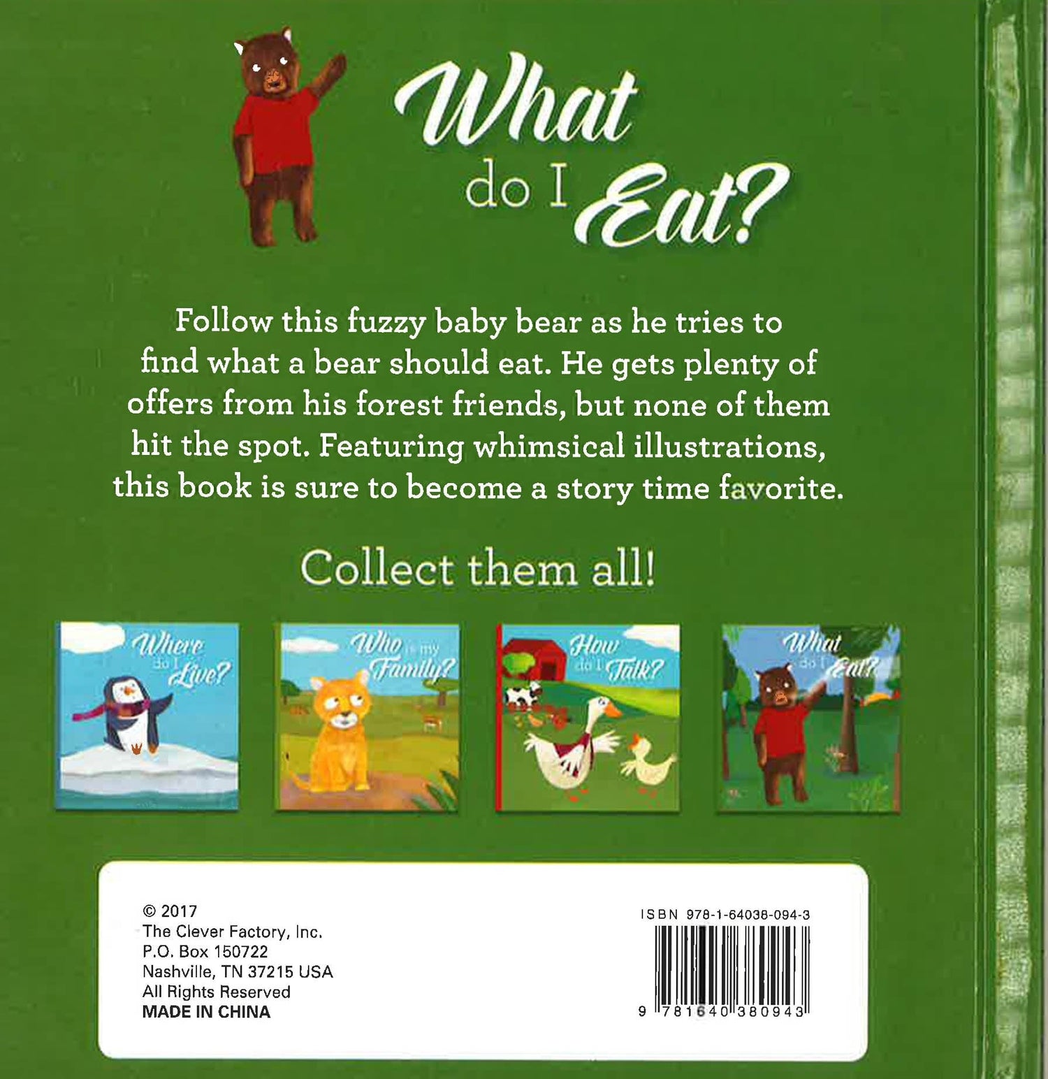 Follow this fuzzy baby bear as he tries to find what a bear should eat. He gets plenty of offers from his forest friends, but none of them hit the spot. Featuring whimsical illustrations, this book is sure to become a story time favorite.
