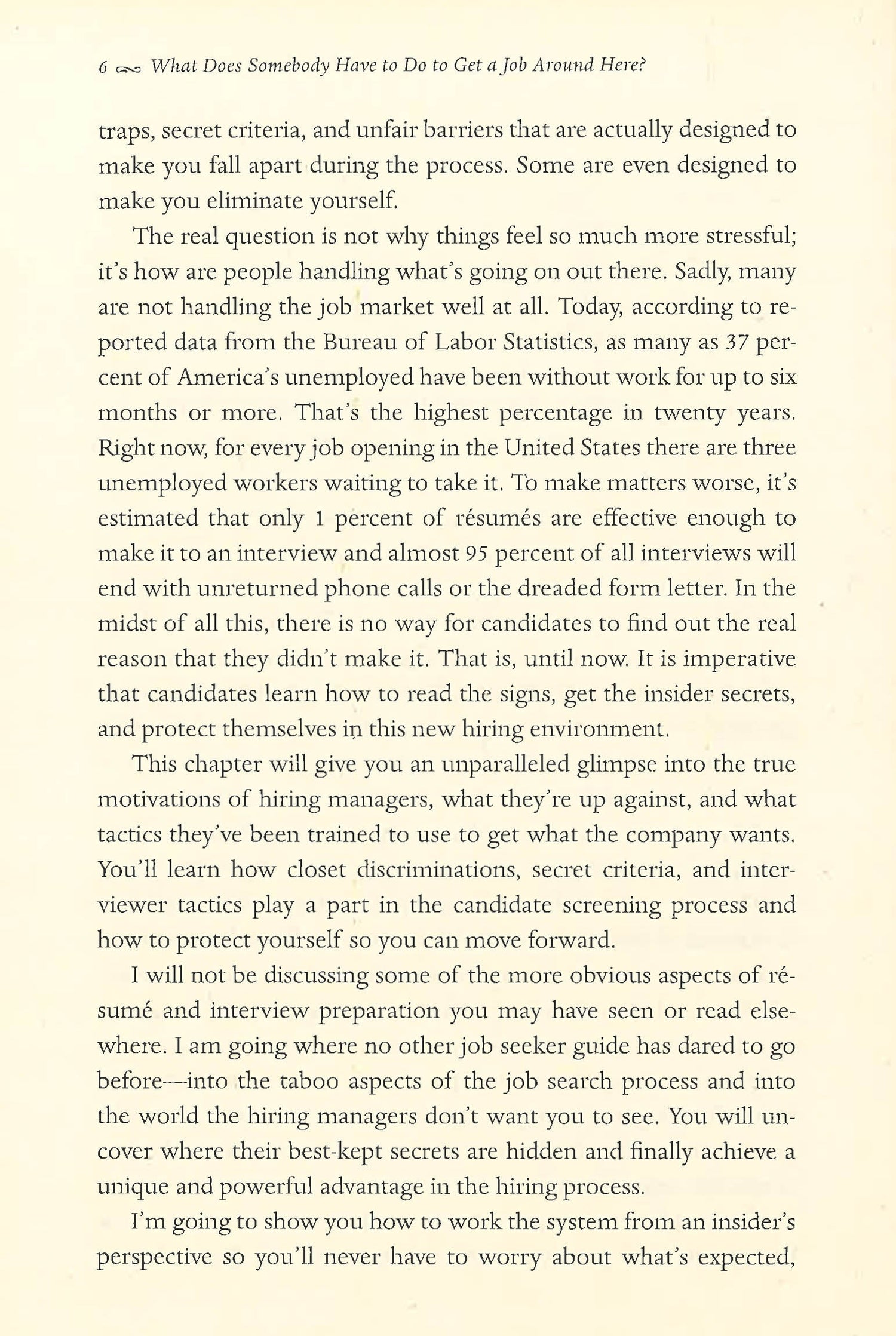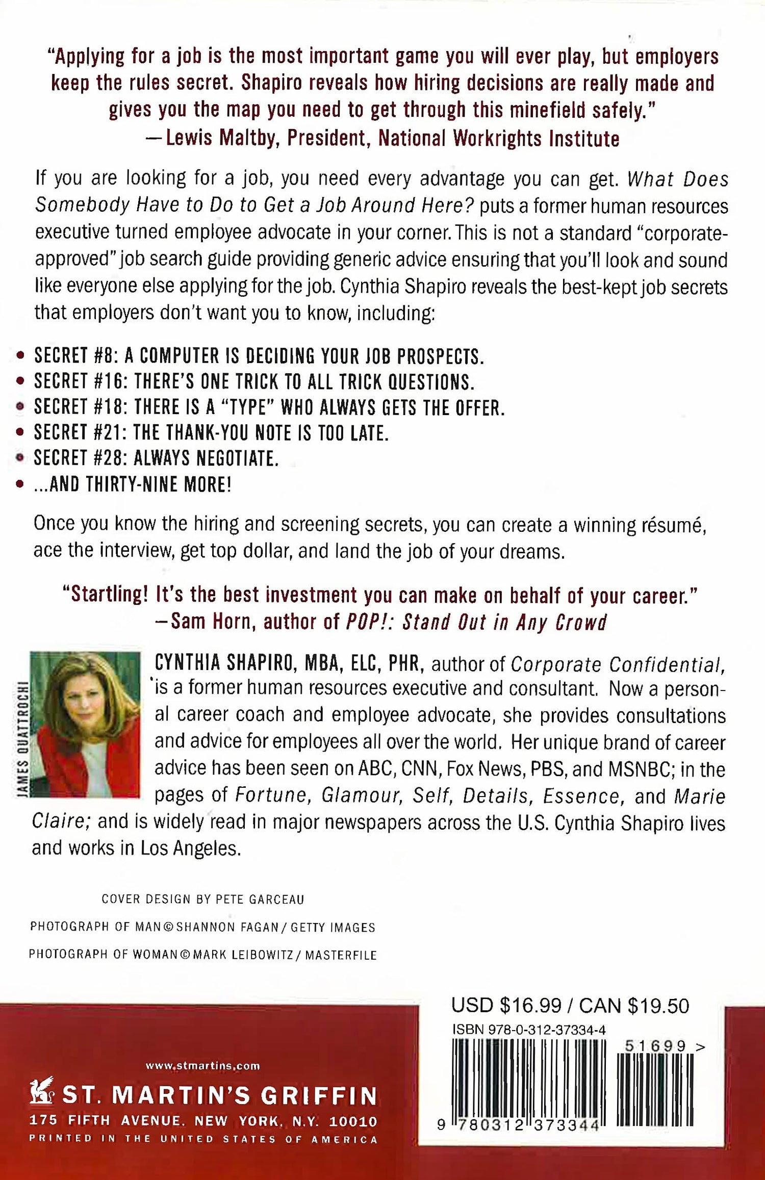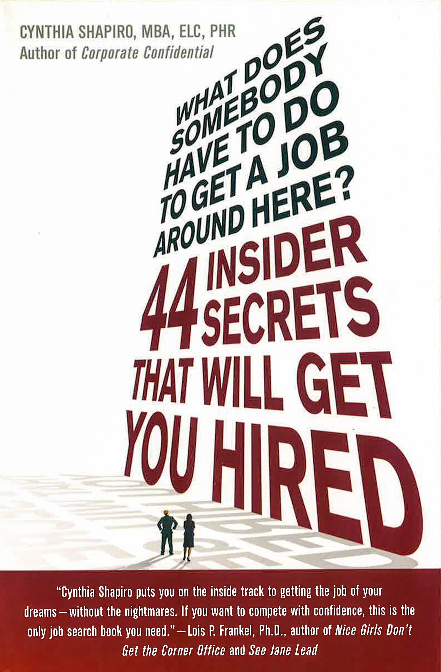 If you are looking for a job you need every advantage you can get. "What Does Somebody Have to Do to Get a Job Around Here?" puts a former Human Resources executive turned employee advocate in your corner. Cynthia Shapiro reveals the best-kept job secrets that employers don't want you to know including: *Secret #8: A computer is deciding your job prospects. *Secret #12: Professional Reference are useless. *Secret #18: There is a "type" that always gets the offer. *Secret #21: The Thank-You note is too late. *Secret #28: Always negotiate. * and thirty-nine more! Once you know the secrets you can create a winning resume, ace the interview, and land the job of your dreams.Cynthia Shapiro, "M.B.A., E.L.C., P.H.R".", "author of "Corporate Confidential, "is a former human resources executive and consultant. Now a personal career coach and employee advocate, she provides consultations and advice for employees all over the world. Her unique brand of career advice has been seen on ABC, CNN, FOX News, PBS and MSNBC; in the pages of "Fortune, Glamour, Self, Details, Essence, Marie Claire, " and is widely read in major newspapers across the U.S. Cynthia Shapiro lives and works in Los Angeles, California.