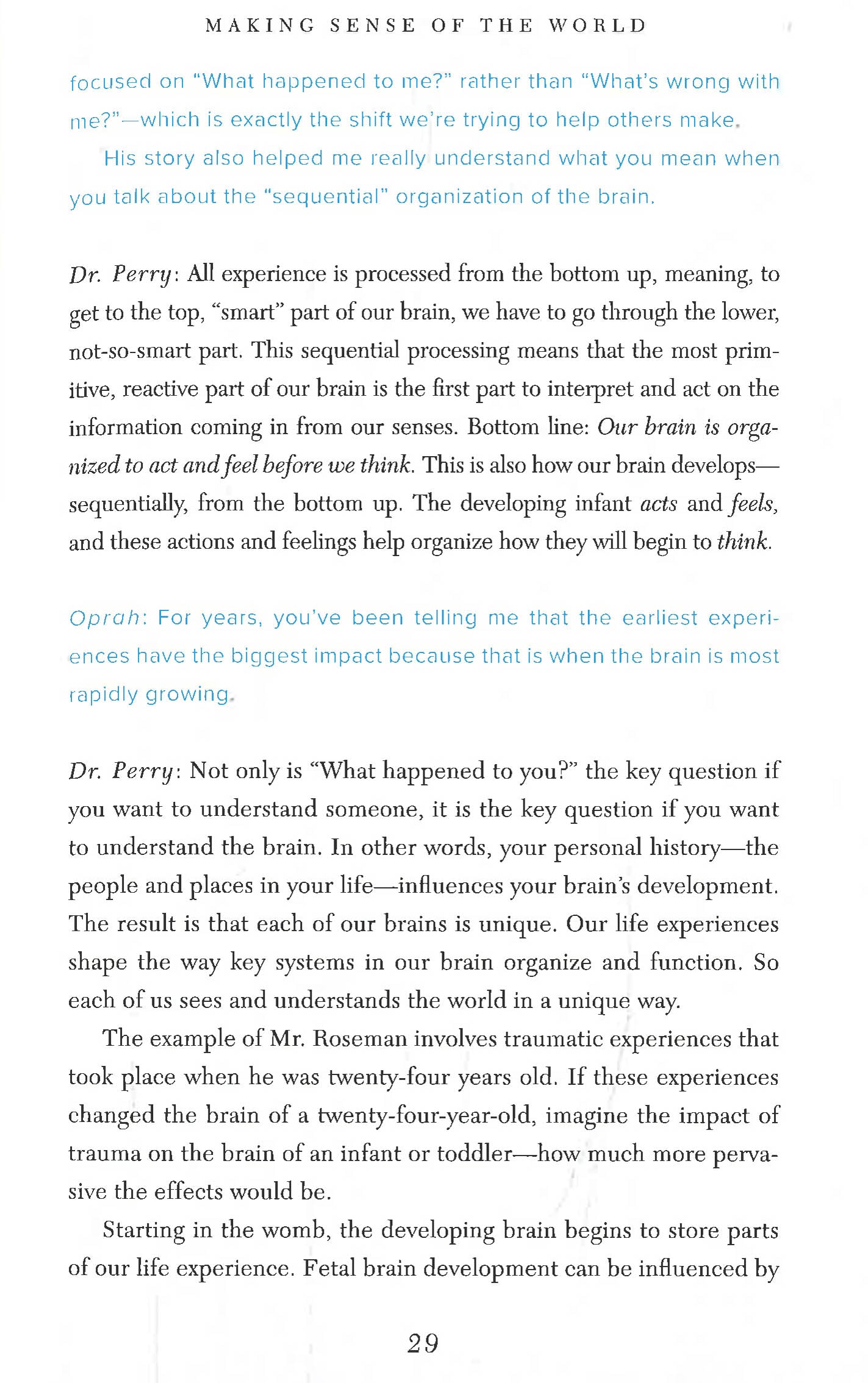 Through wide-ranging and often deeply personal conversation, Oprah Winfrey and Dr Perry explore how what happens to us in early childhood – both good and bad - influences the people we become. They challenge us to shift from focusing on 'What’s wrong with you?' or 'Why are you behaving that way?' to asking 'What happened to you?'. This simple change in perspective can open up a new and hopeful understanding for millions about why we do the things we do, why we are the way we are, providing a road map for repairing relationships, overcoming what seems insurmountable, and ultimately living better and more fulfilling lives.