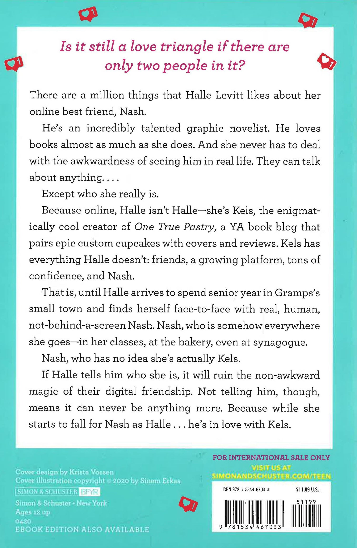 Can a love triangle have only two people in it Online, it can…but in the real world, its more complicated. In this debut novel that’s perfect for fans of Jenny Han and Morgan Matson, Marisa Kanter hilariously and poignantly explores what happens when internet friends turn into IRL crushes.Is it still a love triangle if there are only two people in it There are a million things that Halle Levitt likes about her online best friend, Nash. He’s an incredibly talented graphic novelist. He loves books almost as much as she does. And she never has to deal with the awkwardness of seeing him in real life. They can talk about anything… Except who she really is. Because online, Halle isn’t Halle—she’s Kels, the enigmatically cool creator of One True Pastry, a YA book blog that pairs epic custom cupcakes with covers and reviews. Kels has everything Halle doesn’t: friends, a growing platform, tons of confidence, and Nash. That is, until Halle arrives to spend senior year in Gramps’s small town and finds herself face-to-face with real, human, not-behind-a-screen Nash. Nash, who is somehow everywhere she goes—in her classes, at the bakery, even at synagogue. Nash who has no idea she’s actually Kels. If Halle tells him who she is, it will ruin the non-awkward magic of their digital friendship. Not telling him though, means it can never be anything more. Because while she starts to fall for Nash as Halle…he’s in love with Kels.