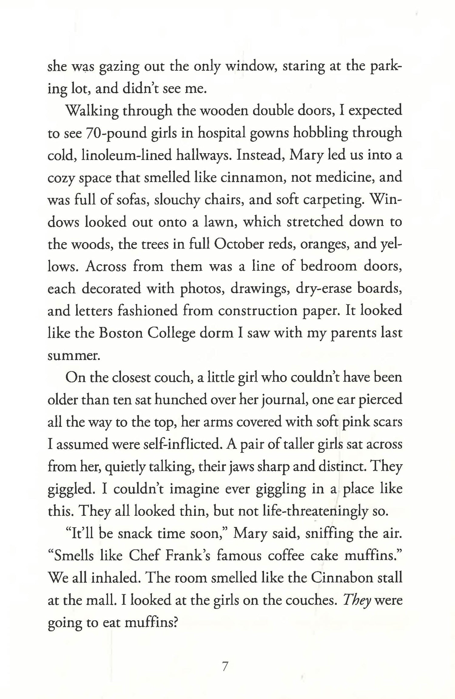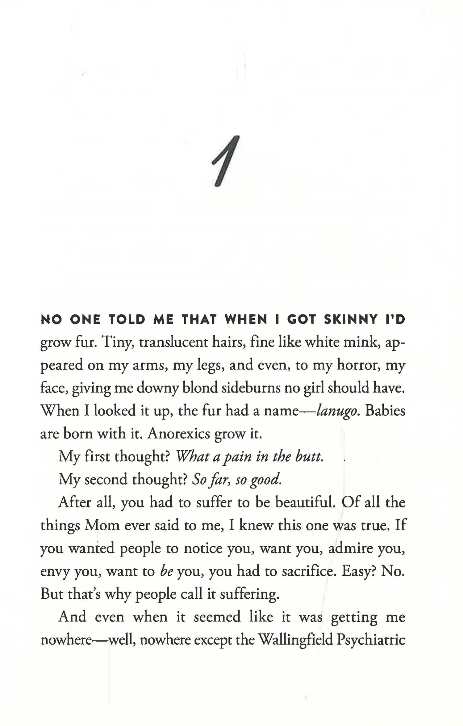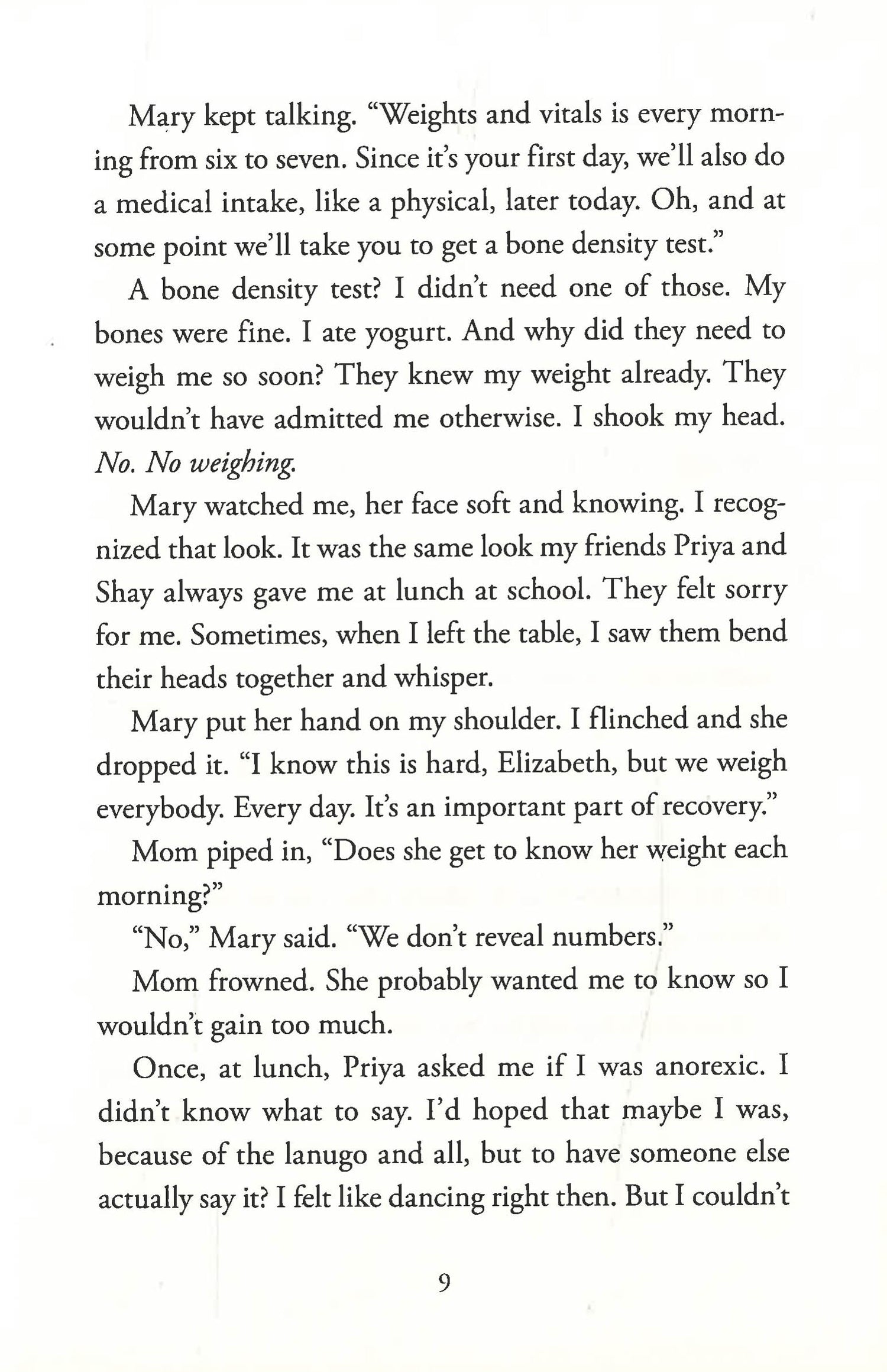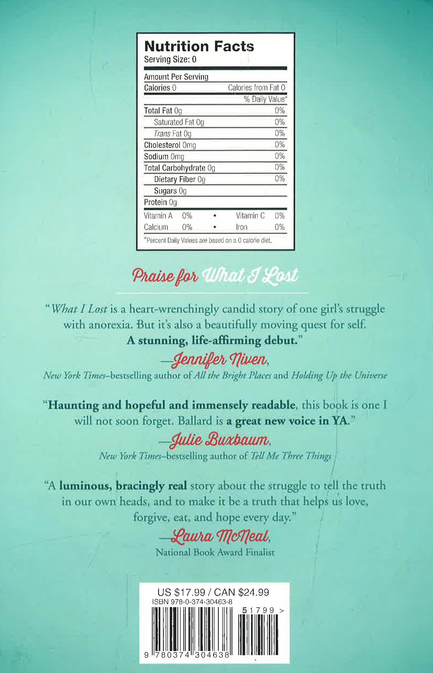 What sixteen-year-old Elizabeth has lost so far: forty pounds, four jean sizes, a boyfriend, and her peace of mind. As a result, she's finally a size zero. She's also the newest resident at Wallingfield, a treatment center for girls like her--girls with eating disorders. Elizabeth is determined to endure the program so she can go back home, where she plans to start restricting her food intake again.She's pretty sure her mom, who has her own size-zero obsession, needs treatment as much as she does. Maybe even more. Then Elizabeth begins receiving mysterious packages. Are they from her ex-boyfriend, a secret admirer, or someone playing a cruel trick? *This Book May Have Remainder Mark* This eloquent debut novel rings with authenticity as it follows Elizabeth's journey to taking an active role in her recovery, hoping to get back all that she lost. show more
