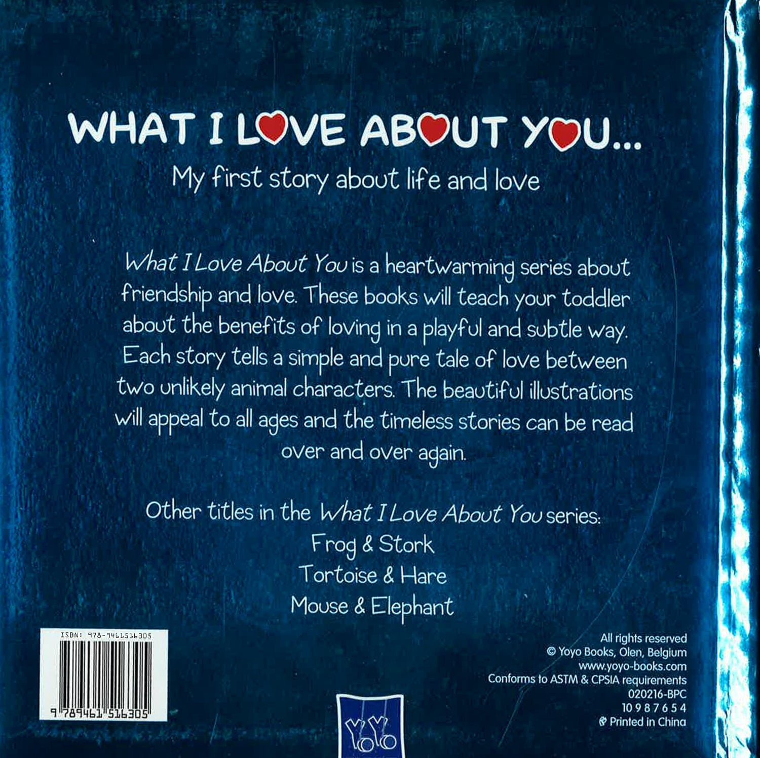 What I love about you is a heartwarming series about frienship and love. These books will teach your toddler about the benefits of loving in a playful and subtle way. Each story tells a simple and pure tale of love between two unlikely animal characters. The beautiful illustrations will appeal to all ages and the timeless stories can be read over and over again.