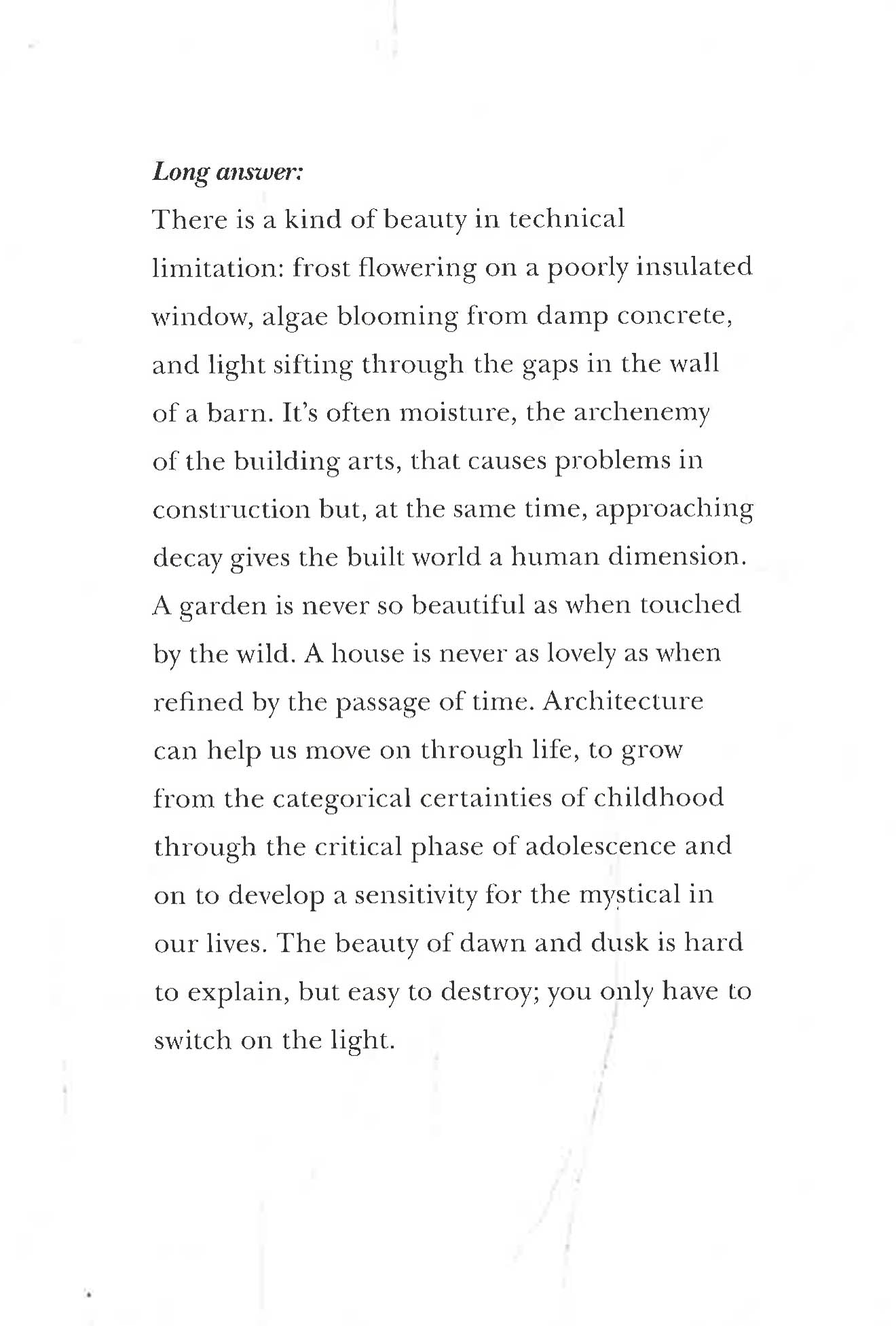 This entertaining and informative book explores the world of architecture through a series of 101 questions and answers that cover a wide range of issues on its practice and theory. There are historical questions, such as 'Who was the first architect?' and 'Are all churches architecture?' as well as ones that relate to contemporary activity, such as 'Have computers changed architecture?' or 'How small can a home be?'. There are also many that are intriguing and irreverent, such as 'Why do architects want to paint the world white?' and 'Is Dubai a city?'. For each of the questions there is a brief, one-line answer and then a more extended discussion. Aimed at both general readers as well as those in the field, this book will make a perfect purchase or gift for anyone interested in architecture.