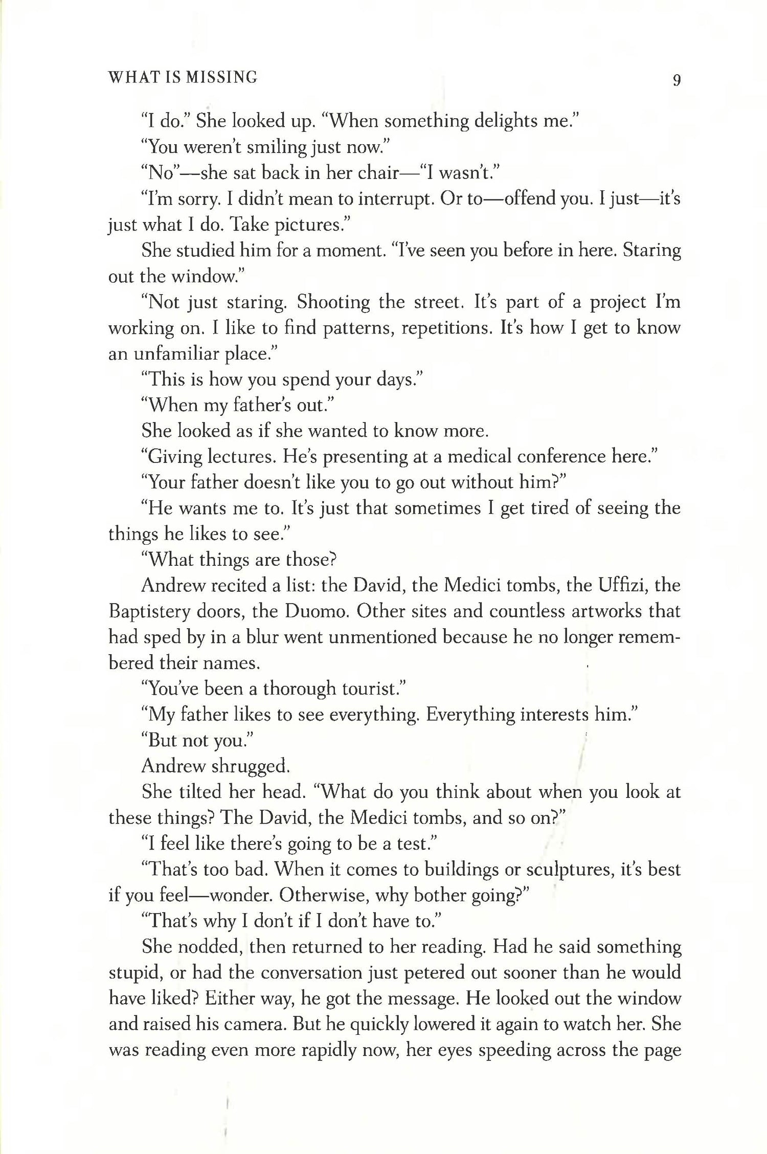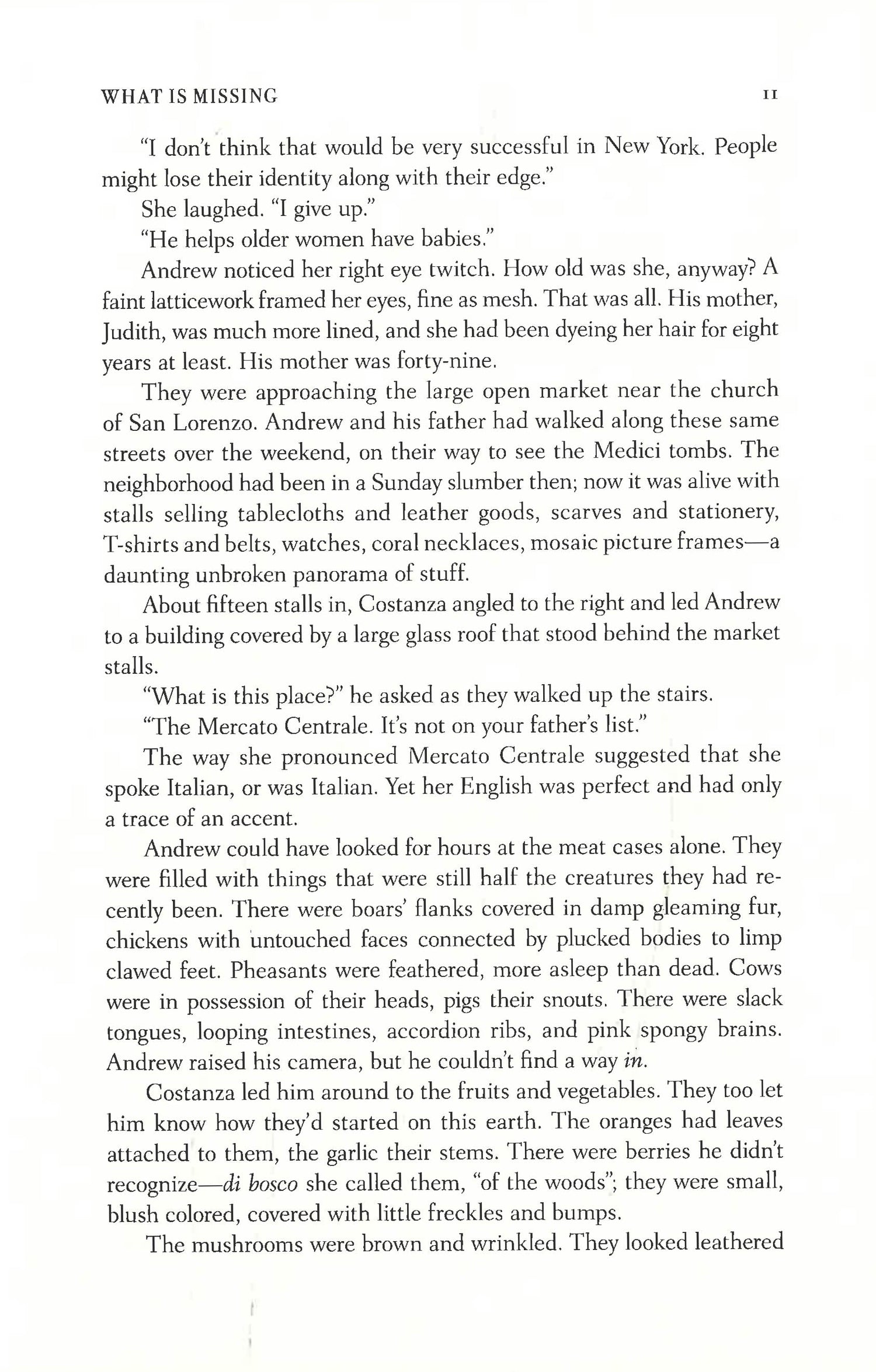 With three lives each marked by heartbreak and absence—of a child, a parent, a partner, or a clear sense of identity—What is Missing offers Costanza, Andrew, and Henry the opportunity to make themselves whole when the triangle resumes three months later in New York, where the relationships among them turn and tighten with combustive effects that cut to the core of what it means to be a father, a son, and—for Costanza—a potential mother.